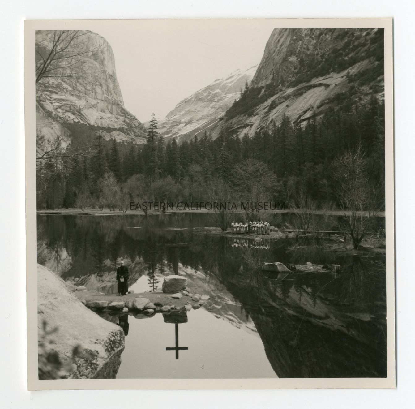 Photo of Mirror Lake in Yosemite. There is a man (priest?) standing next to a cross on a rock, and on an island in the middle of the lake appears to be a choir.