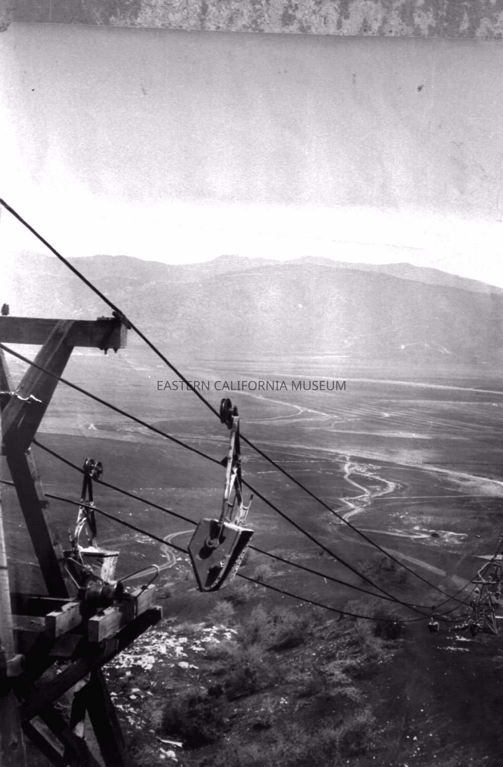 B& W digital scan of an Aerial Tram, some 4,700' long, hauling limestone from the South Quarry to a 250 ton bin near base of hill. The Tram had a capacity of 30 tons per hour. The limestone was transported some six miles to the LADWP Cement Plant at Monolith which produced cement for the LA Aqueduct.Collection