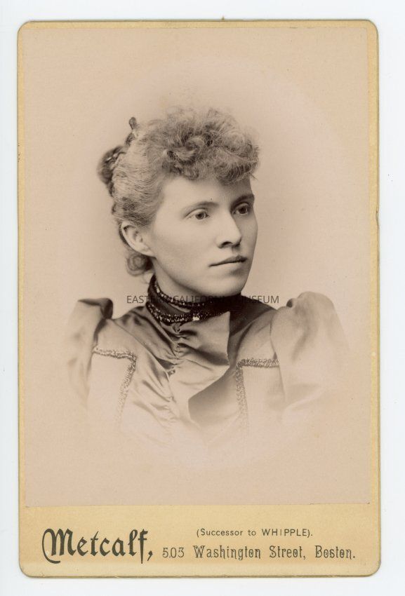 Mounted bust length studio portrait of a woman. Photographer was Metcalf, the successor to Whipple, of Boston.