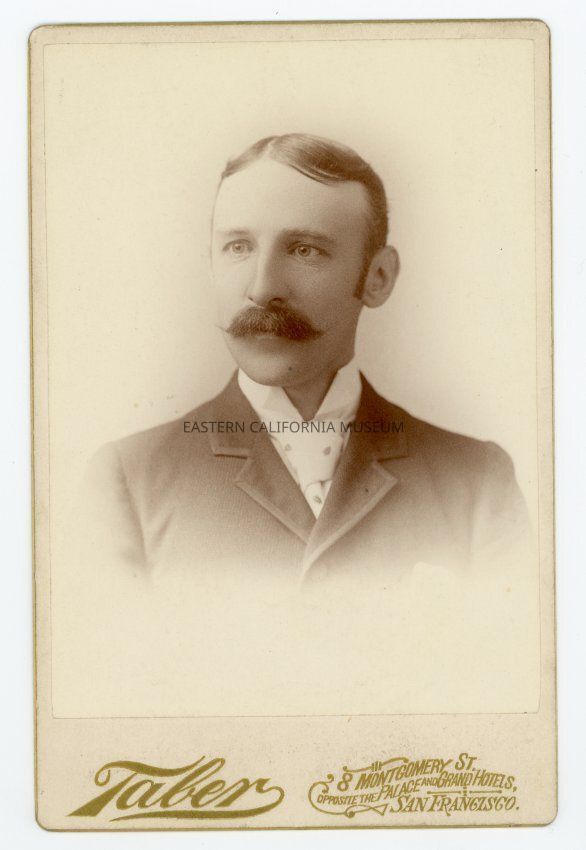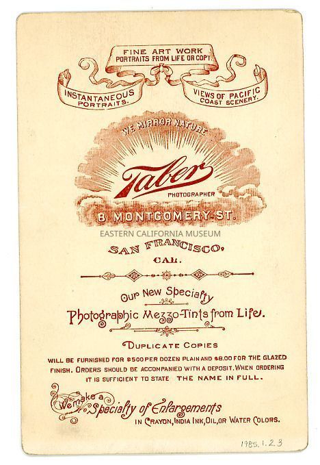 Mounted bust length studio portrait of a man with a white collar and tie. Photographer was Taber of San Francisco.