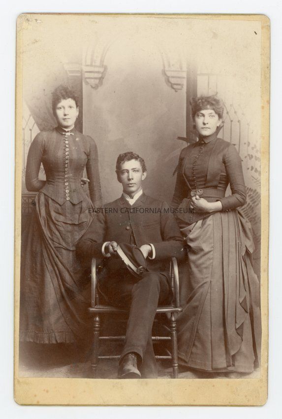 Mounted full length studio portrait of two standing women and a seated young man in the center. He is holding a cap in his hands.