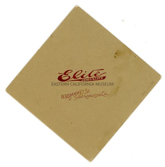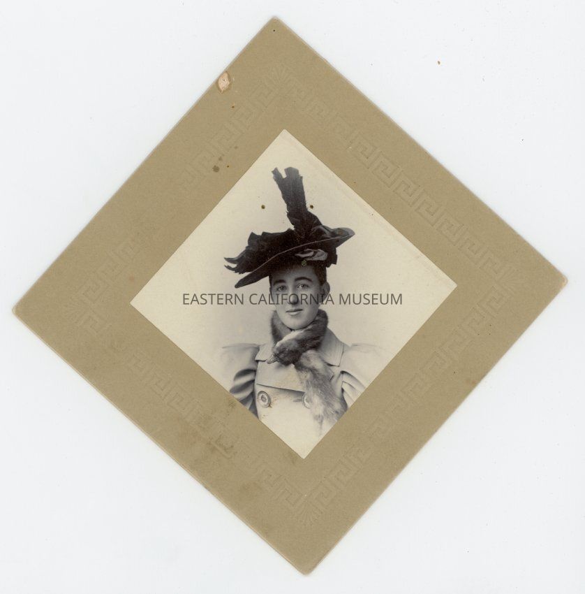 Mounted photograph of a woman wearing a fur stole and large hat. Photographer was Elite, Jones and Lotz, of San Francisco. The edges of the mount are embossed with a greek key design.Collection