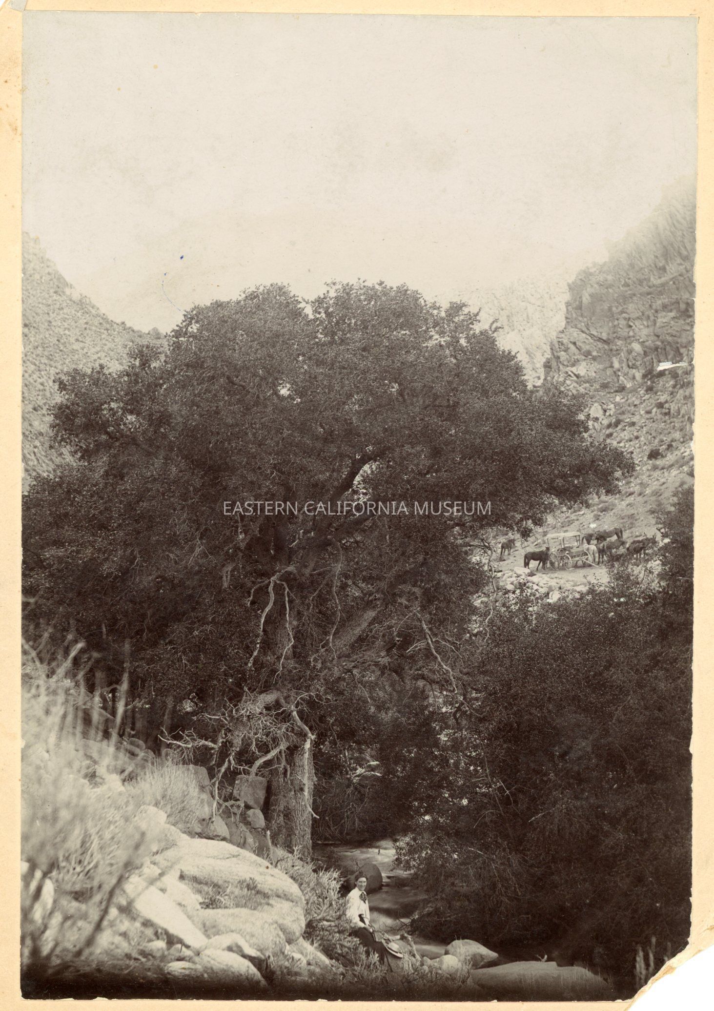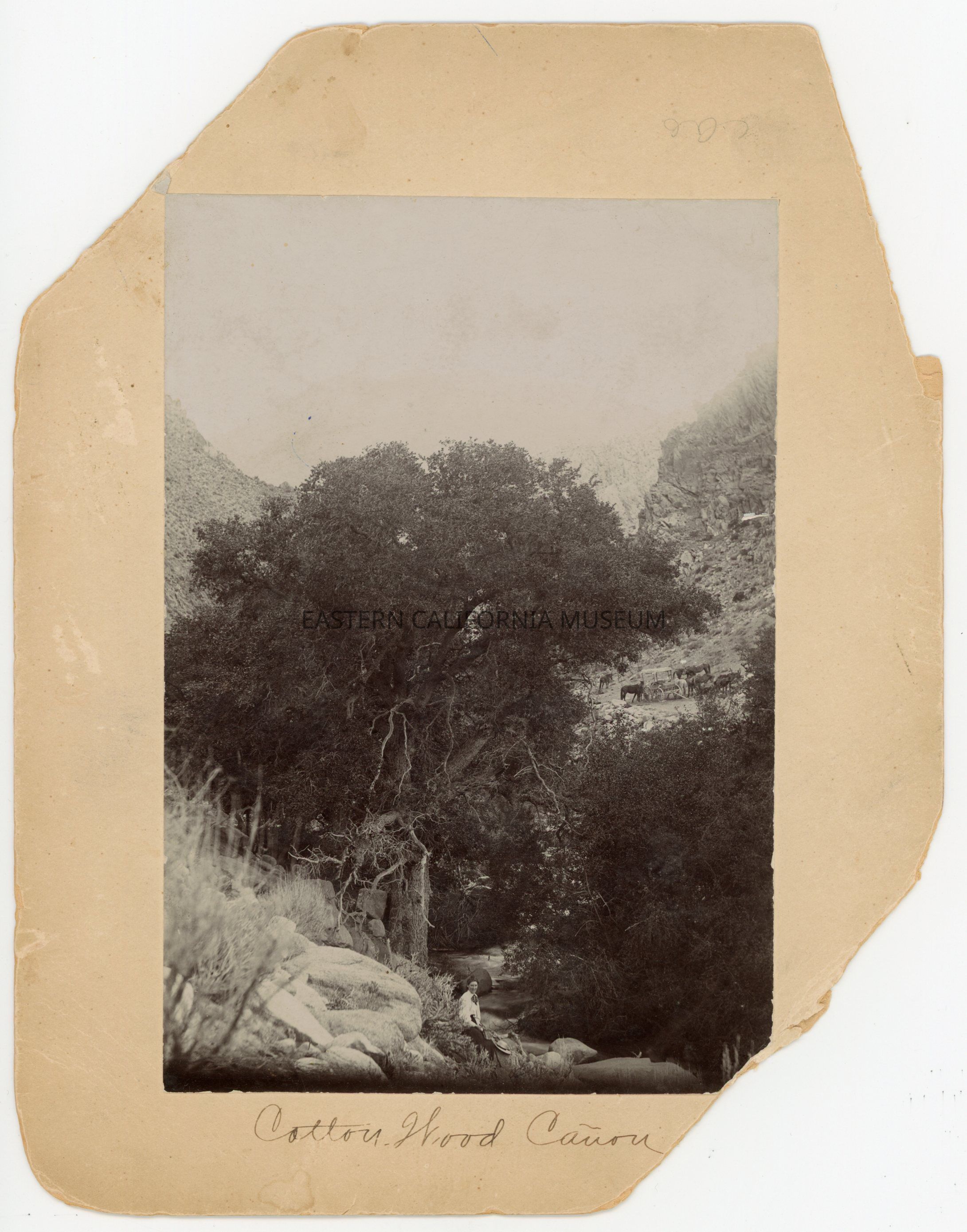 Mounted photo of Cottonwood Canyon, possibly taken in the 1890s. There is a person in the foreground (Adeline Meysan?) sitting near the creek. Across the creek in the upper right is a four wheeled wagon with horses around it (but not hitched up). Written along bottom edge of mount is, "Cotton Wood Canon." Three of the four corners of the mount are missing.