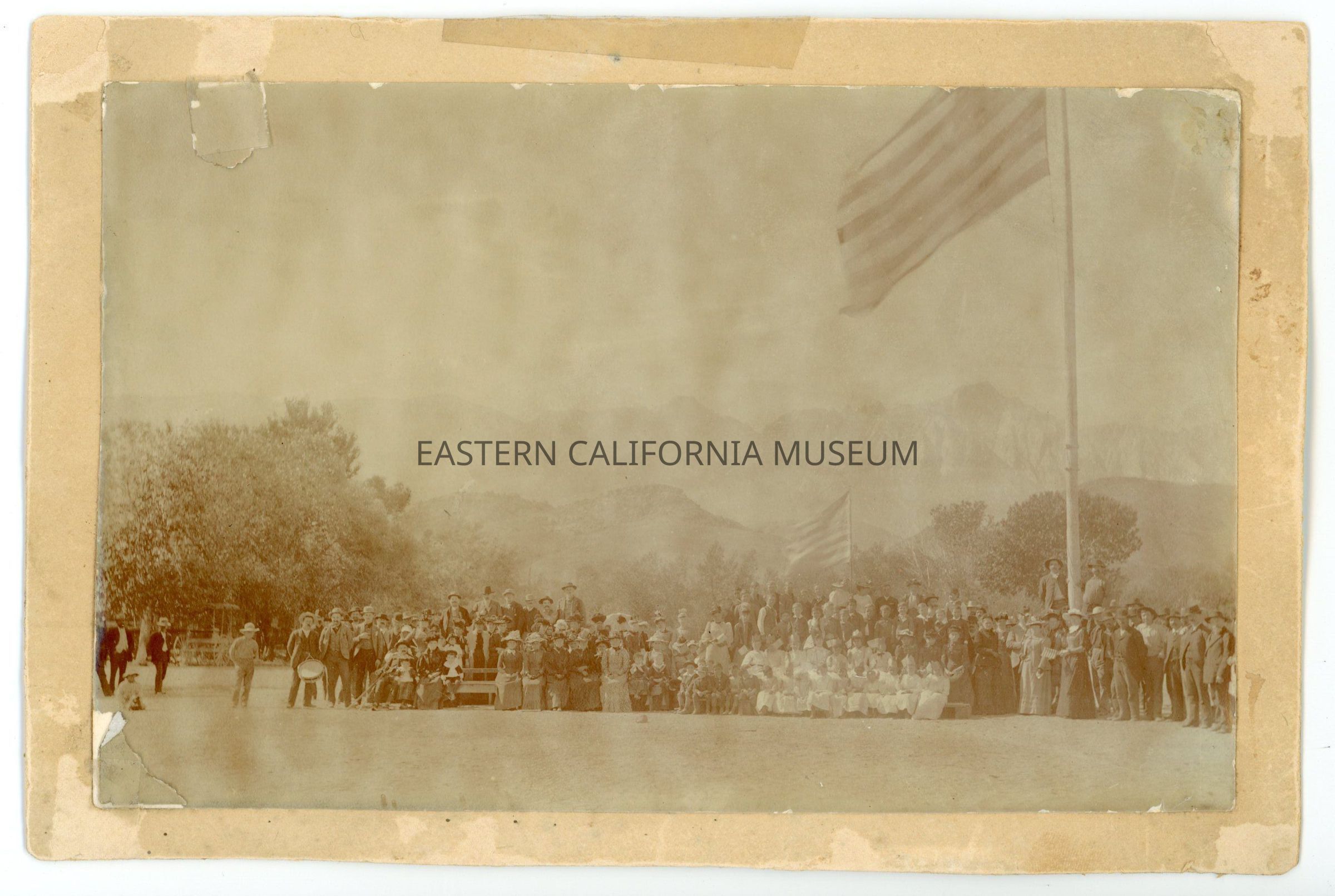 Mounted photo of a large group of people gathered in Lone Pine. There are two large American flags flying, a man with a drum on the left, and in the center a large group of women wearing white dresses. The Alabama Hills and Sierra Nevada mountain range are visible in the background.