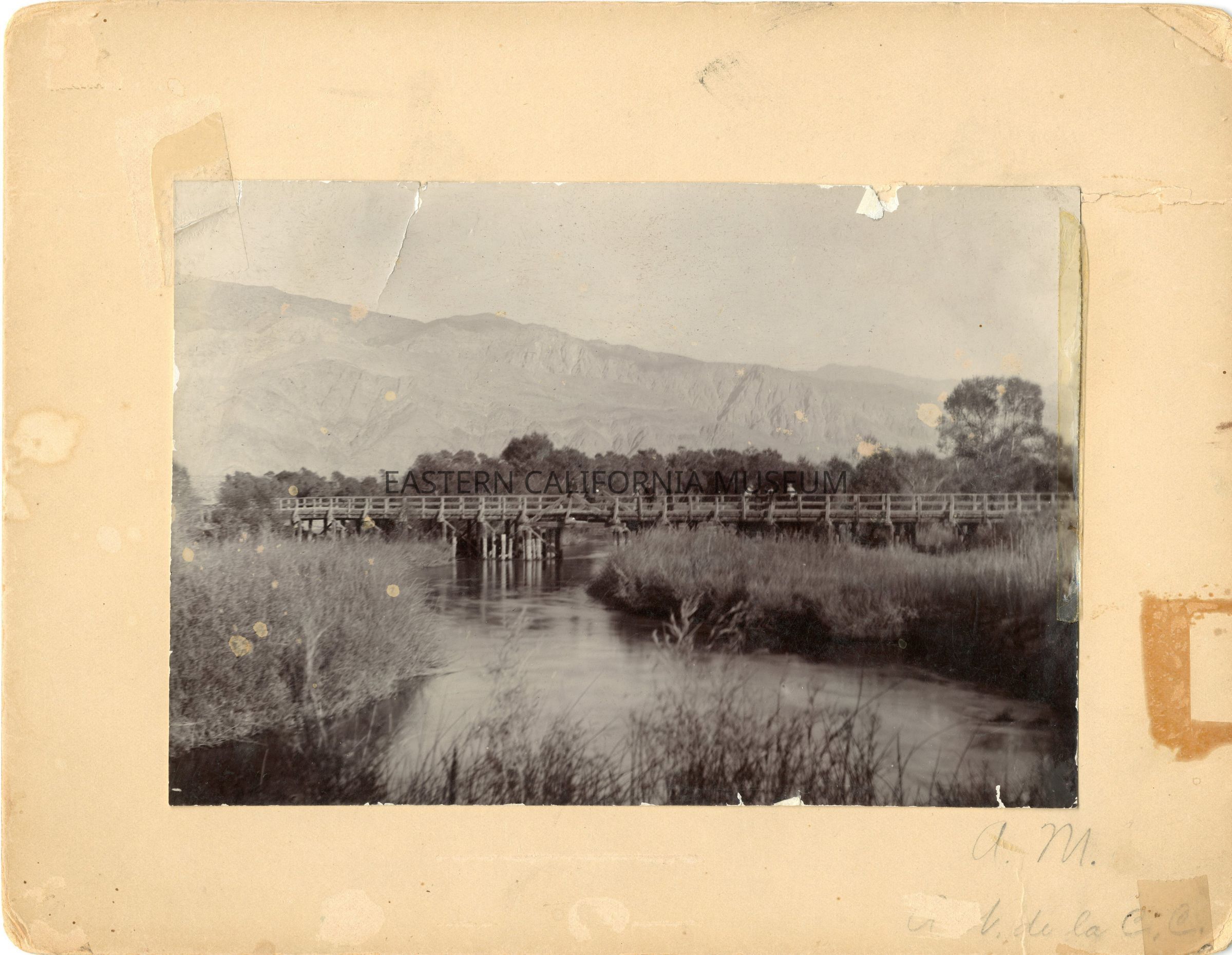 Mounted photo of old Turner Bridge south of Lone Pine near Keeler. Written in lower right corner in pencil is "A.M." and "[illegible] de la C. C."
