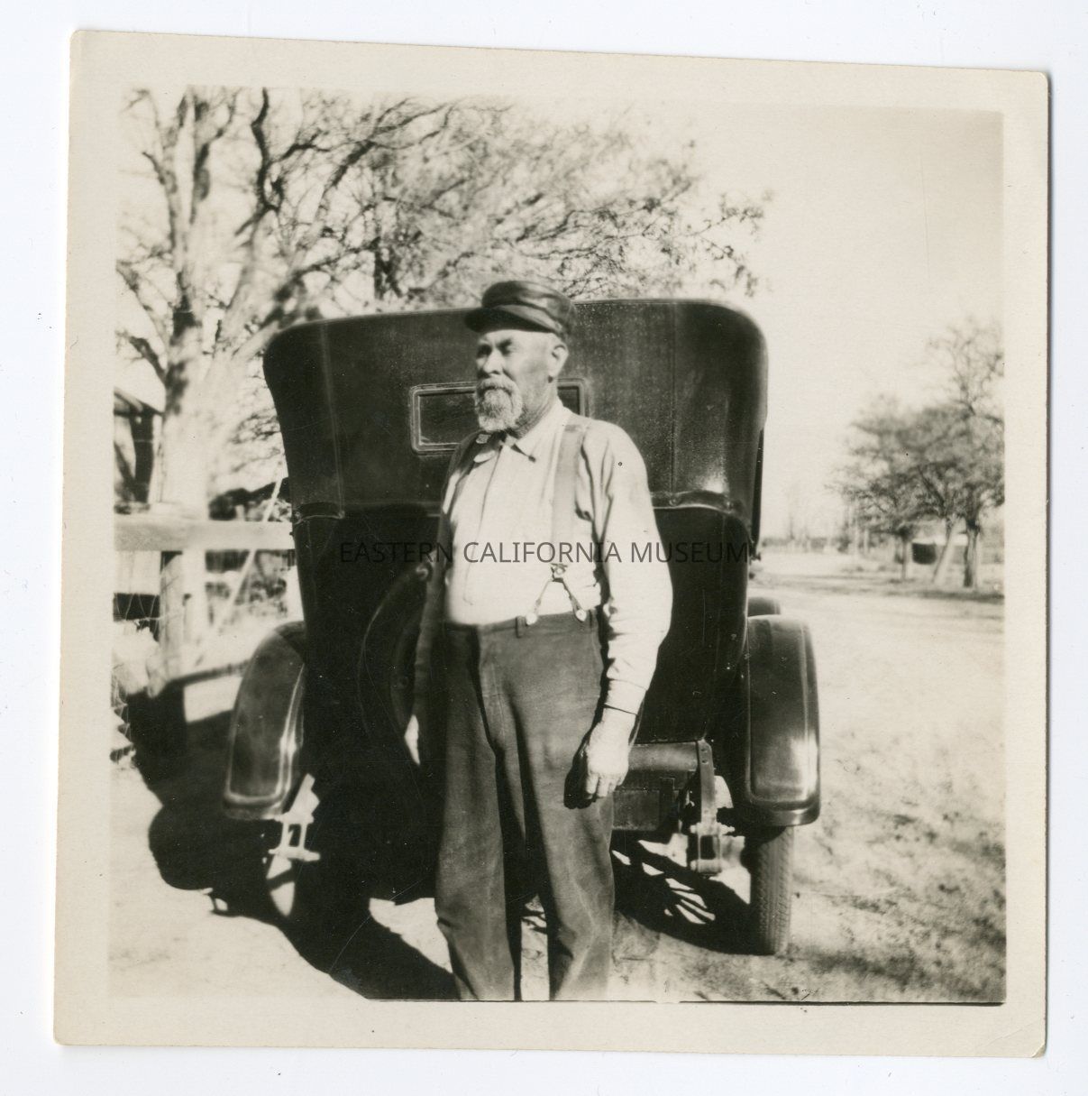 Photo of a man identified as Mike Anton standing behind an early automobile.