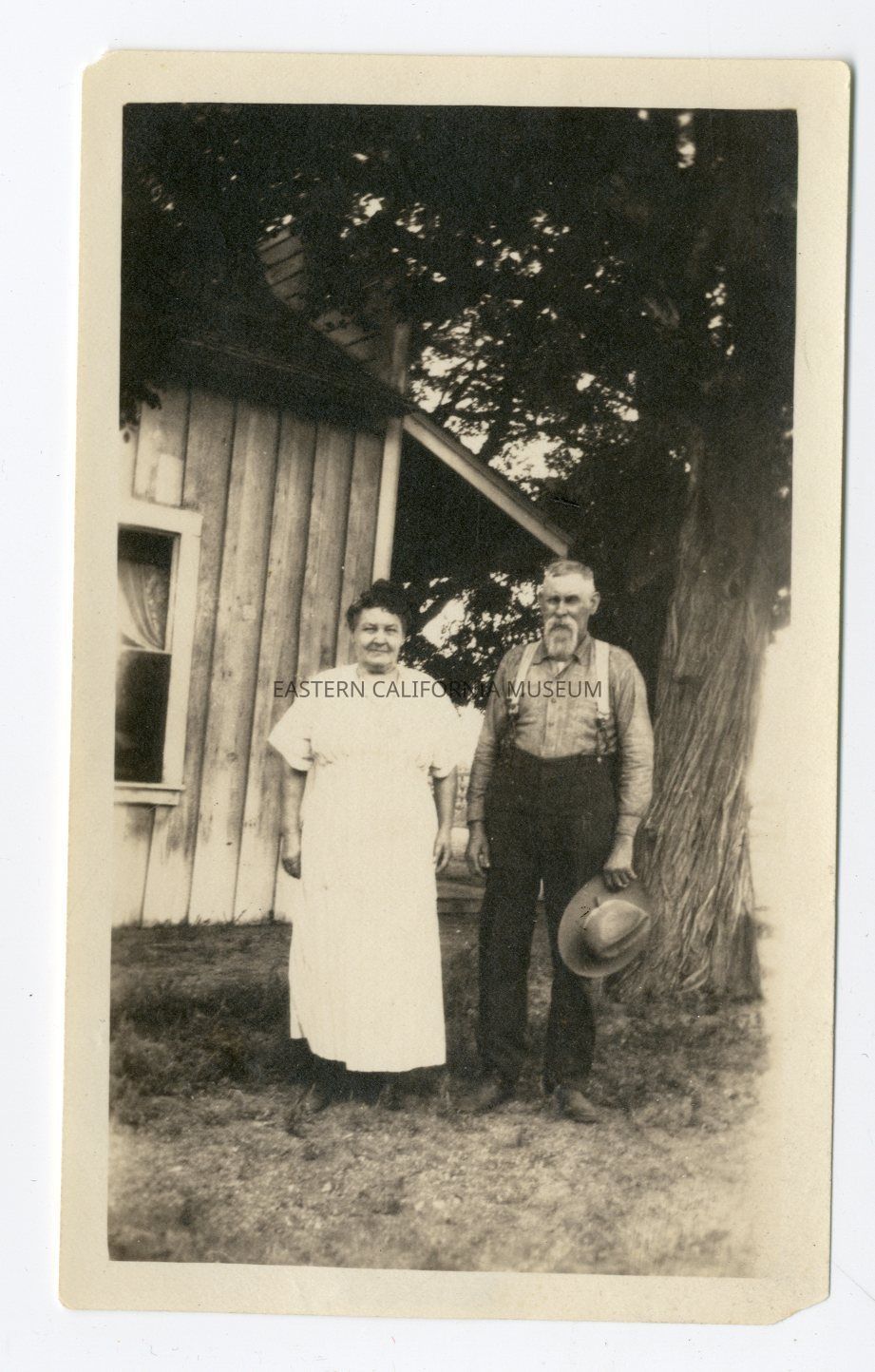 Photo of a couple identified as Amelia and Mike Anton. They are standing outside in front of a house and large tree. Amelia passed away in 1927 and Mike passed in 1932.