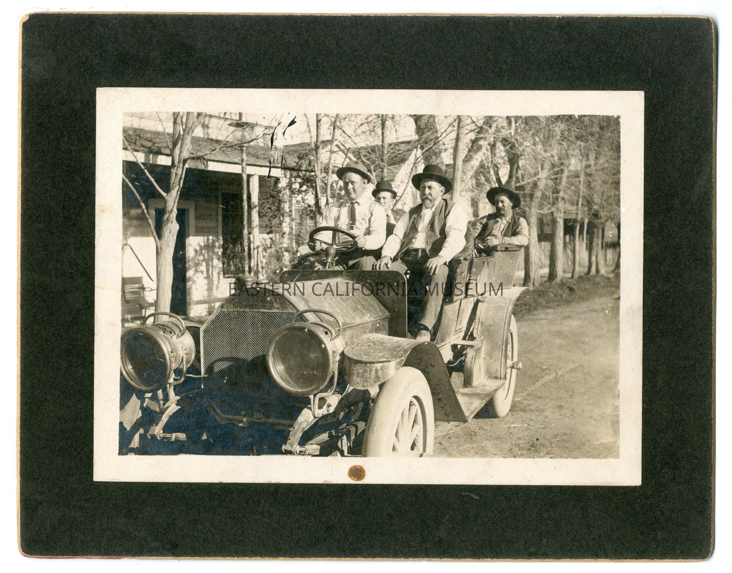 Mounted photo of four men in an early automobile parked in front of a row of houses. Clarence and John Anton are in the front seat.Collection
