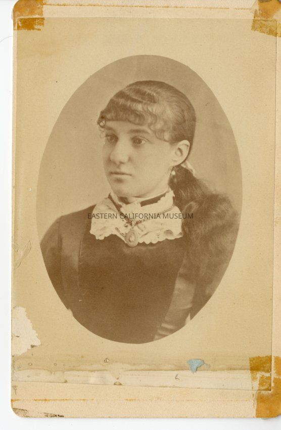 Mounted photo of Minnie Harris Joseph, wife of Mr. Louis Joseph. She was the mother of Irving Joseph. She was part of the Harris family of "Harris & Rhine" fame in Independence. She is a young girl in the photo, with bangs and long, crimped/curly hair, wearing earrings and a large necklace or brooch.