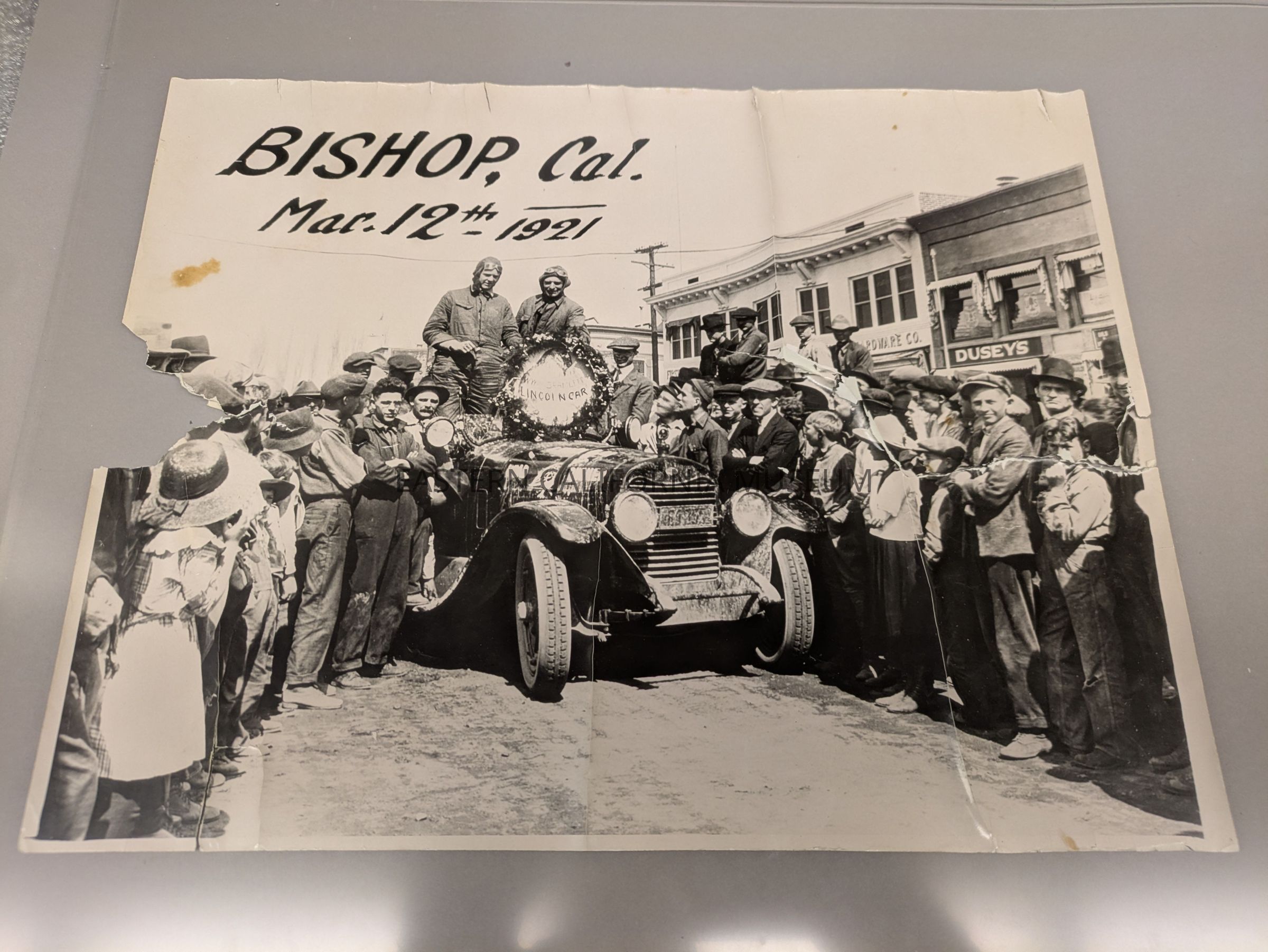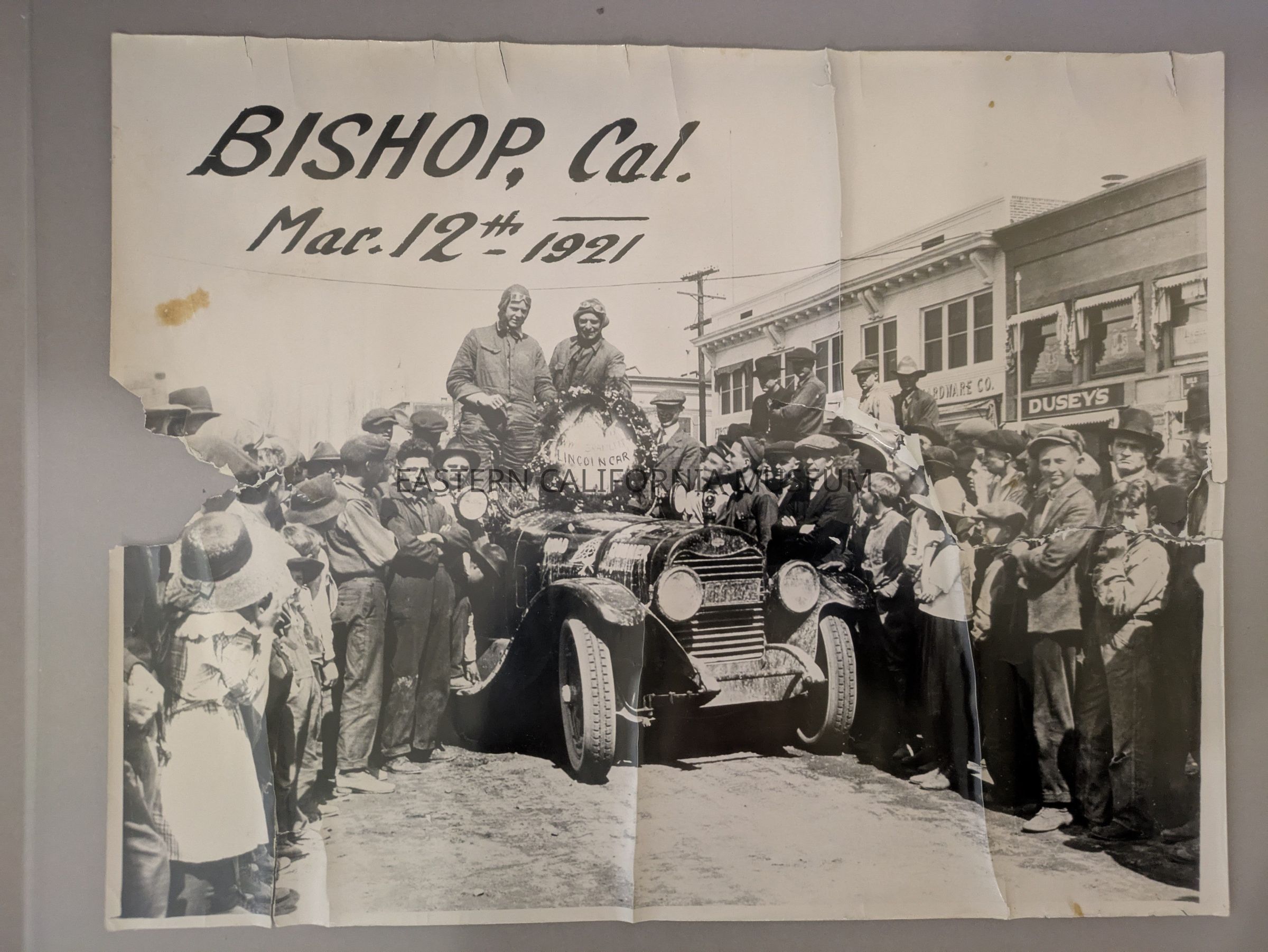 Photo of William Bramlette and Pete Bramlette (mechanic) celebrating in a Lincoln car as it is parked near the intersection of Main and Line Streets in Bishop on March 12, 1921. Mr. Bramlette broke an early speed record between Bishop and Los Angeles. The two men are holding a plaque or wreath and are surrounded by a crowd of people. Note their clothing: coveralls, leather caps, and goggles. The race would have been very dusty.Photograph Details