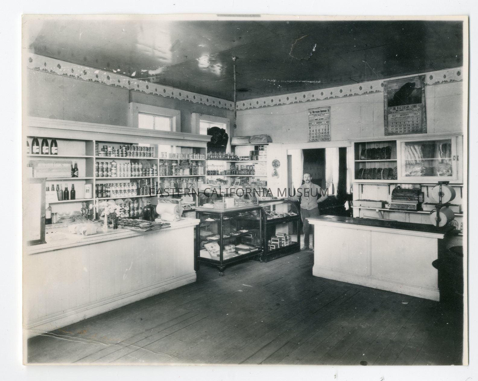 Interior photo of a man standing in a store. There are two August 1913 calendars hanging on the wall that say "Watterson Hardware" and "The Watterson Store."