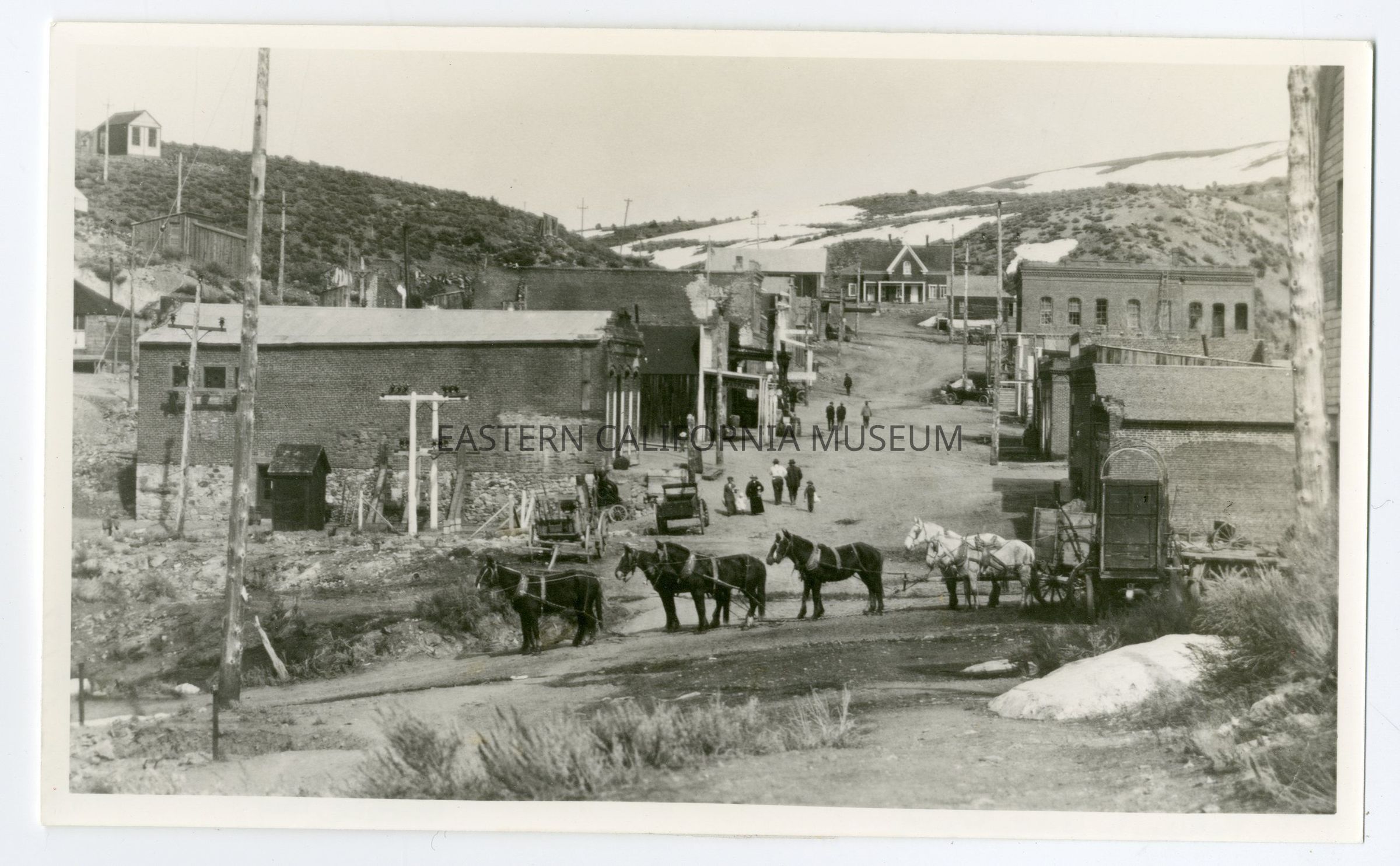 Photo of a town (Aurora, NV, circa 1905?) built on a sloping hill. There is a team of 8 horses in the foreground, and most of the buildings are made of bricks and are two stories tall. There are patches of snow on the hillside.