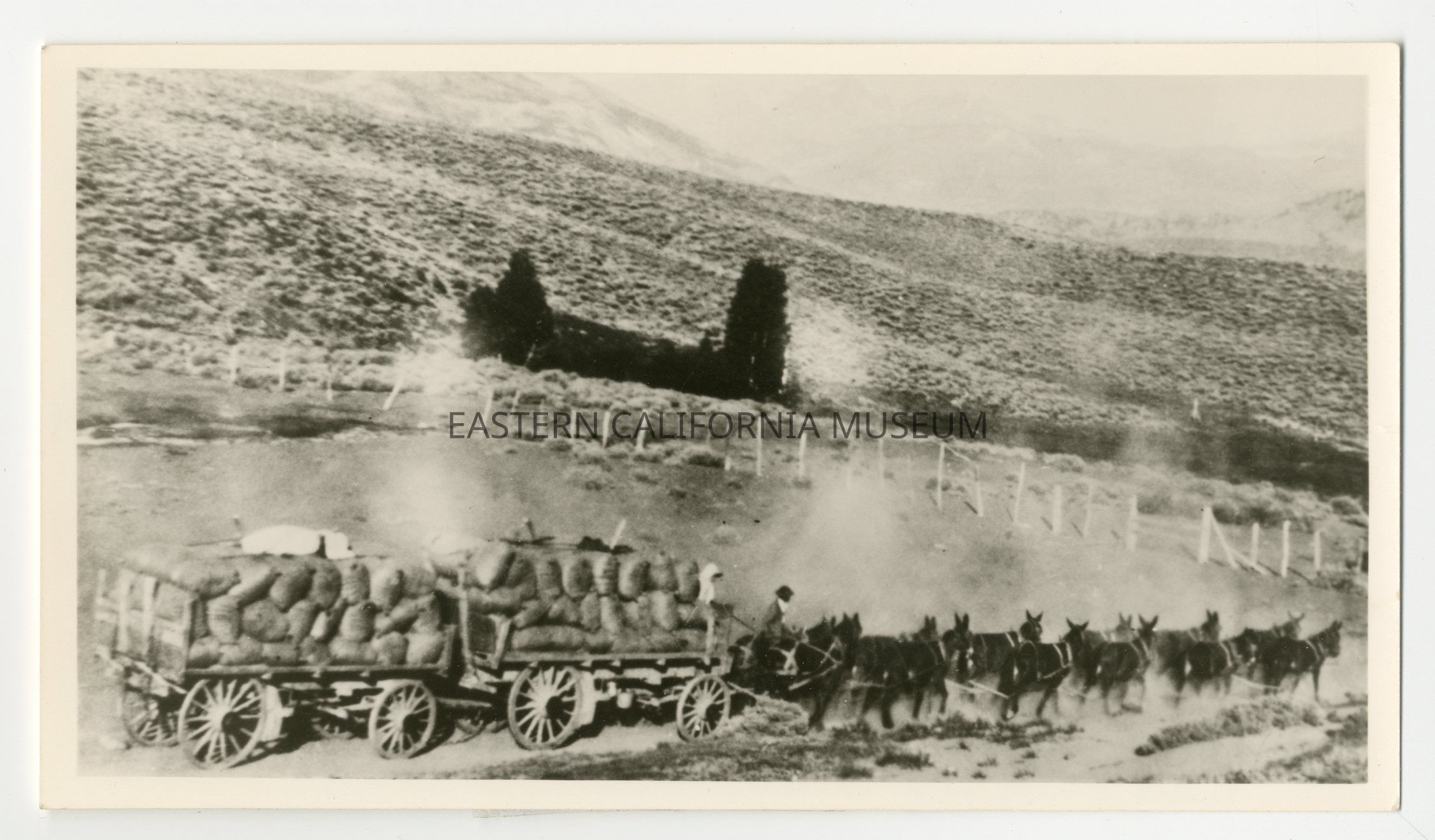 Photo of a double wagon being hauled by twelve horses or mules. The wagons are loaded with bags.
