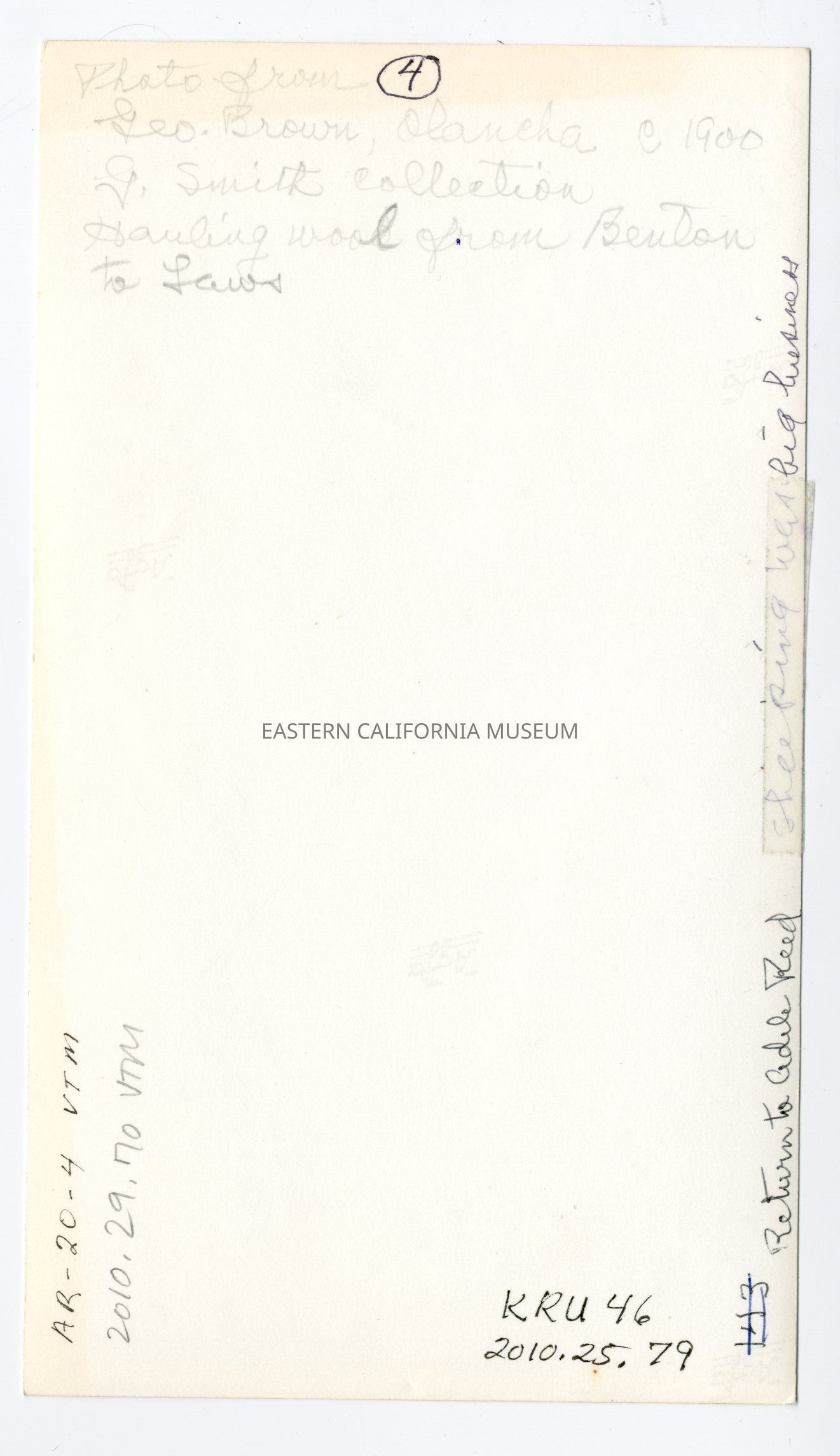Written on reverse: Photo from Geo. Brown, Olancha, c. 1900. G. Smith Collection. Hauling wool from Benton to Laws. Sheeping was Big Business.Collection