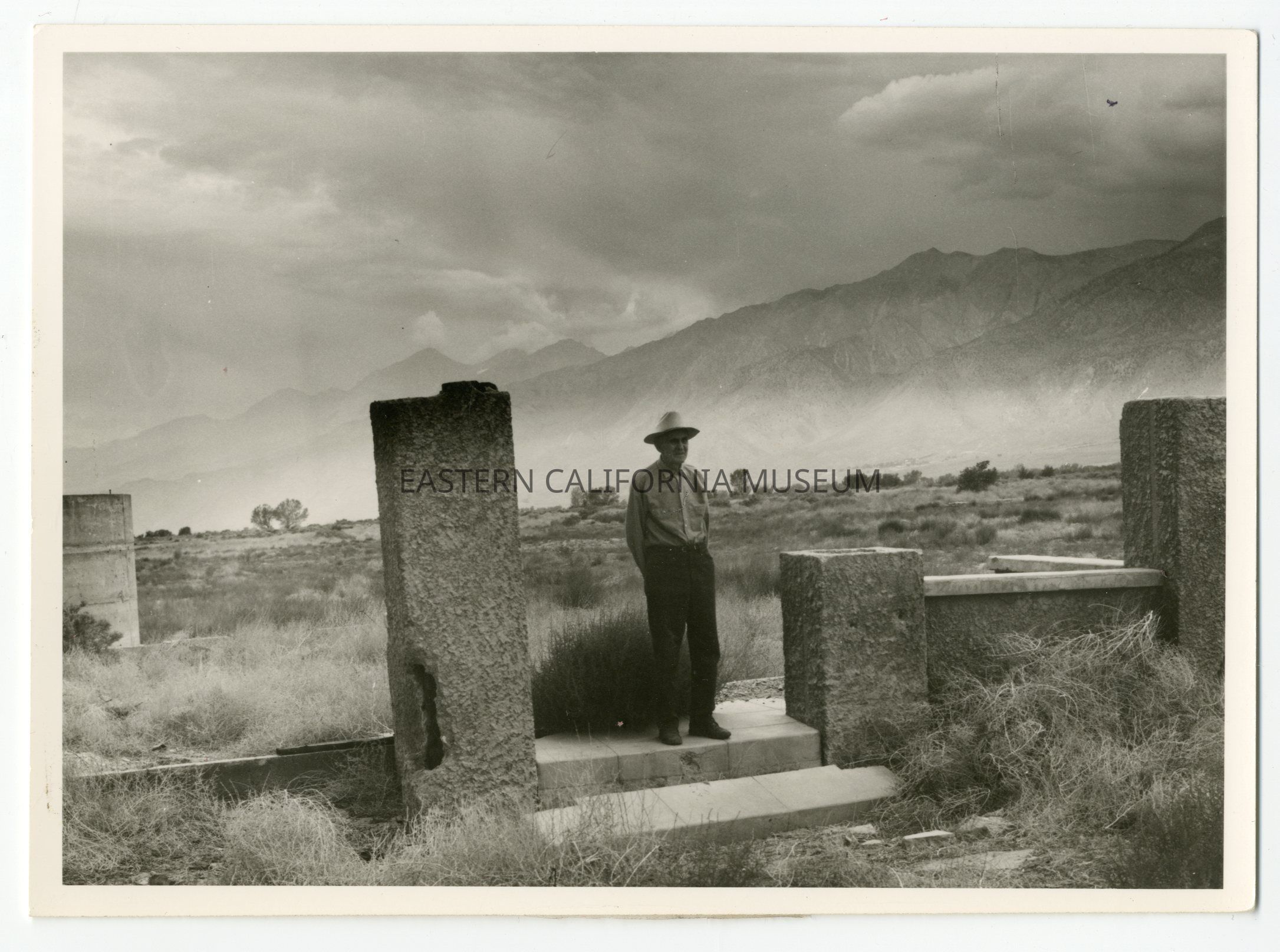 Photo of an older man standing on the concrete steps to a building that no longer exists. The Sierra Nevada mountain range is in the background, as well what appears to be a round silo.