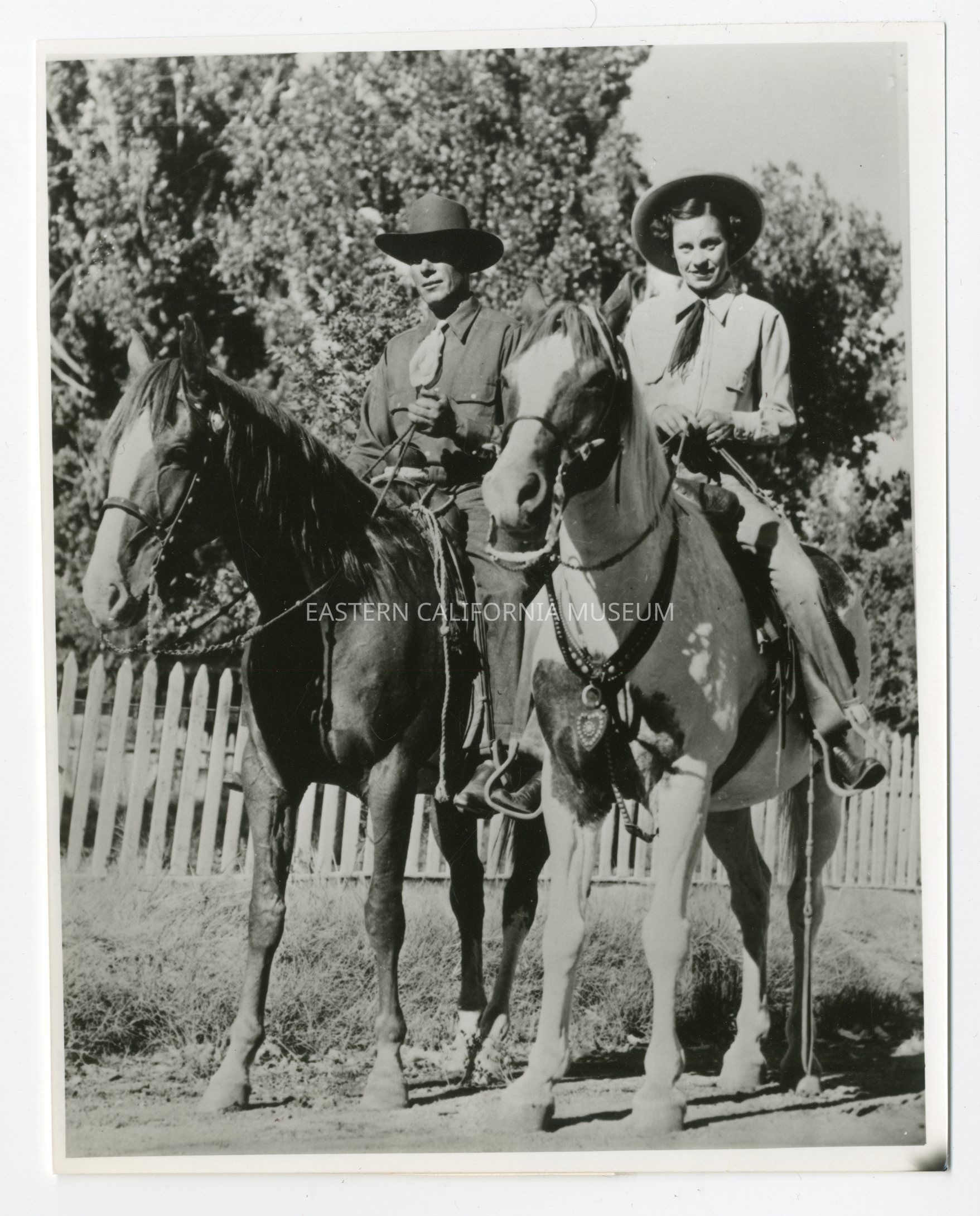 Photo of a woman and man on horseback. There is a white picket fence in the background. Written on reverse: Cattlemen.