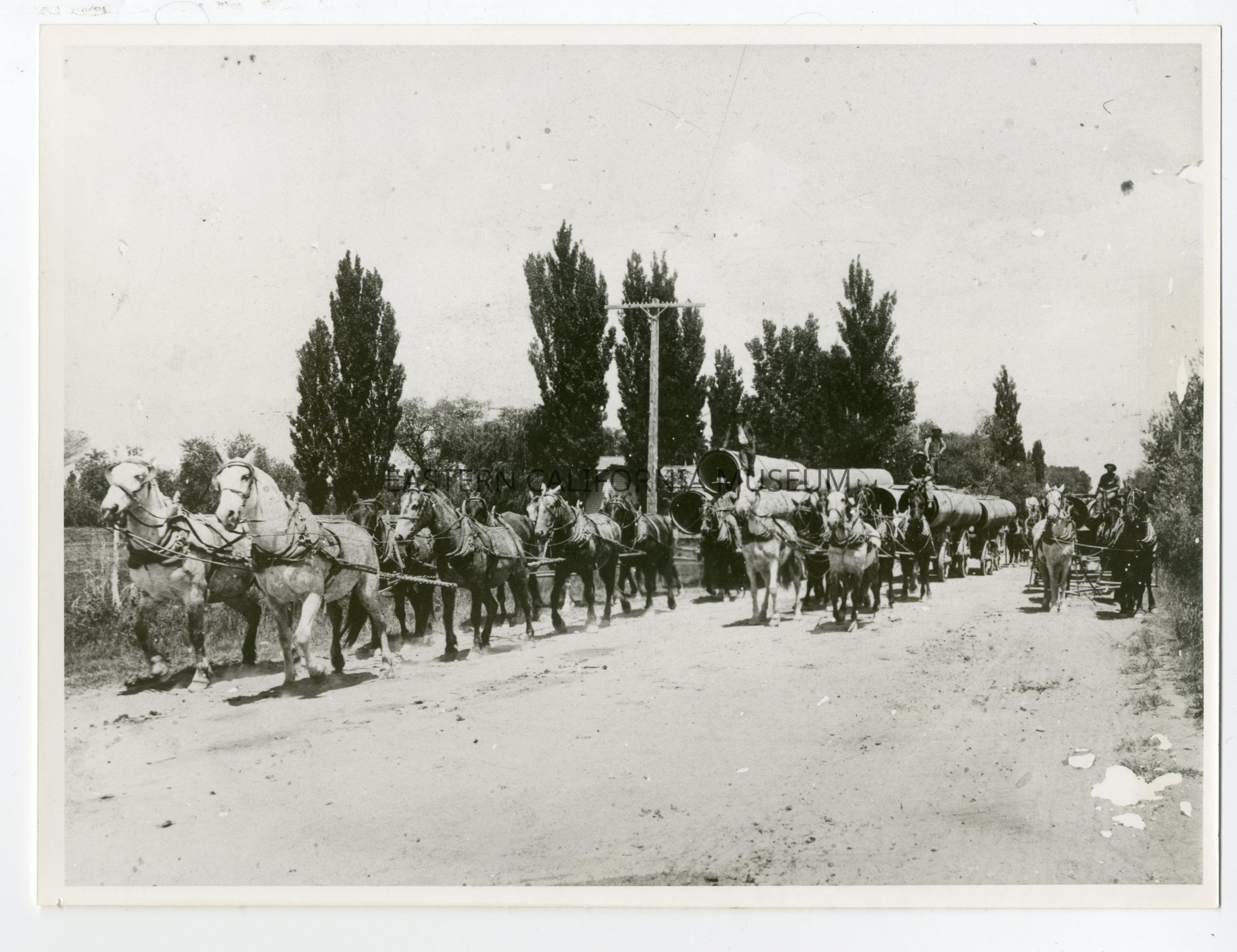 Photo of three separate horse teams pulling wagons loaded with pipes. It looks like two of the teams might be hauling a double wagon load.