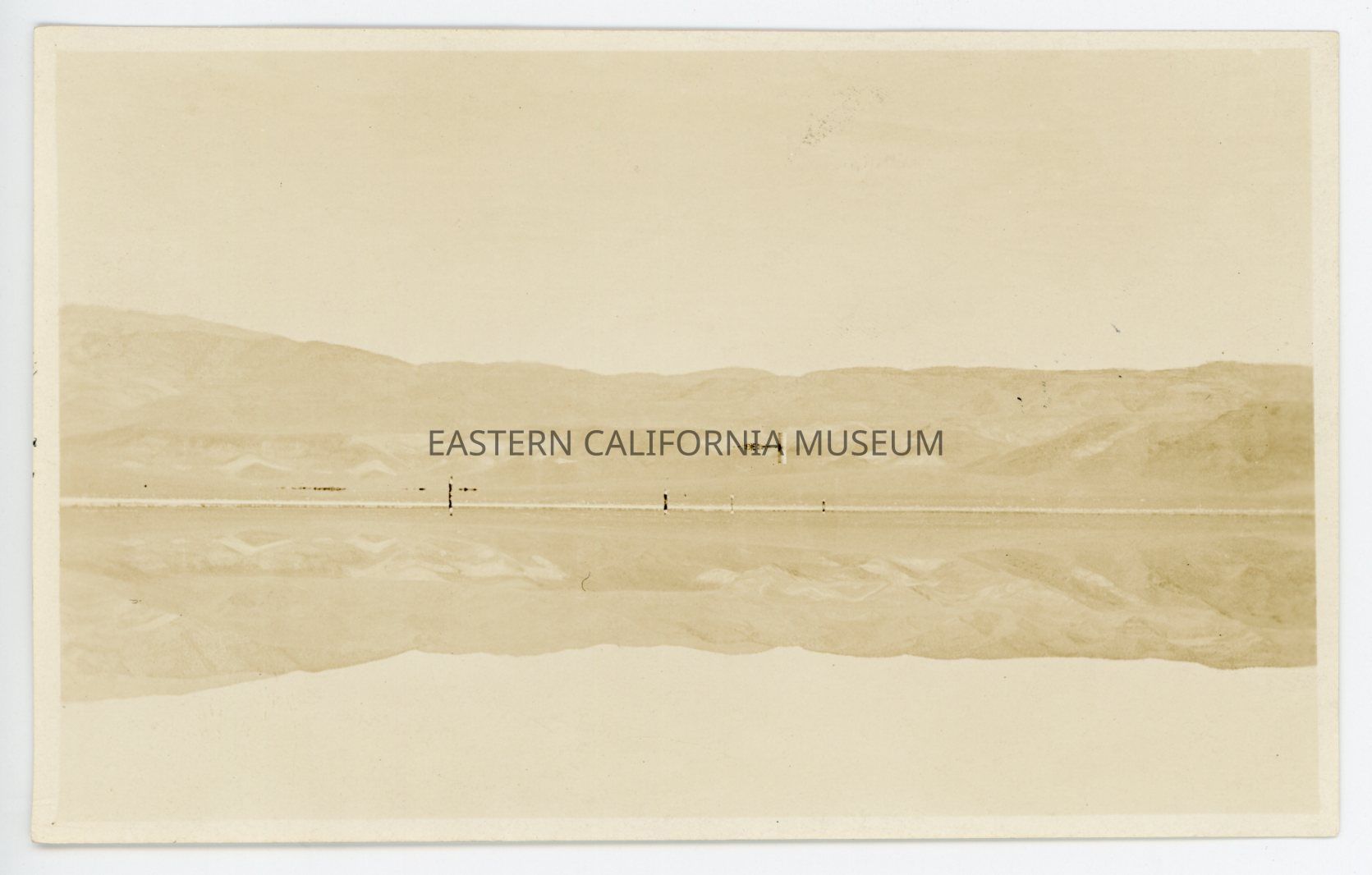 Photo of a lake reflecting the mountains in the background. It looks like there is some sort of silo structure on the opposite shore, probably related to the Inyo Chemical Company. There are a few reflections that may be up to four people standing in the water or on the shore. The location and date are almost certainly Deep Springs, 1925.