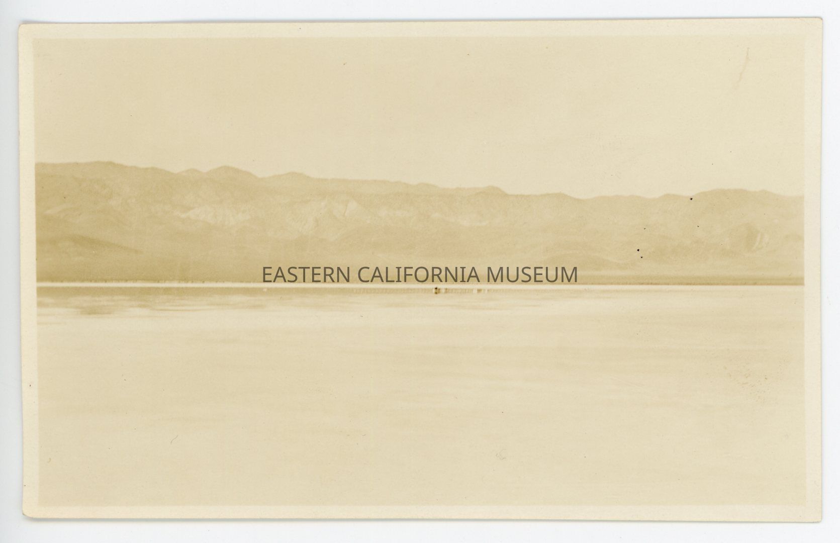 Photo of a lake with mountains in the background. It looks like there is some sort of structure in the middle of the lake, or perhaps on the opposite shore, probably related to the Inyo Chemical Company. The location and date are almost certainly Deep Springs, 1925.Photograph Details