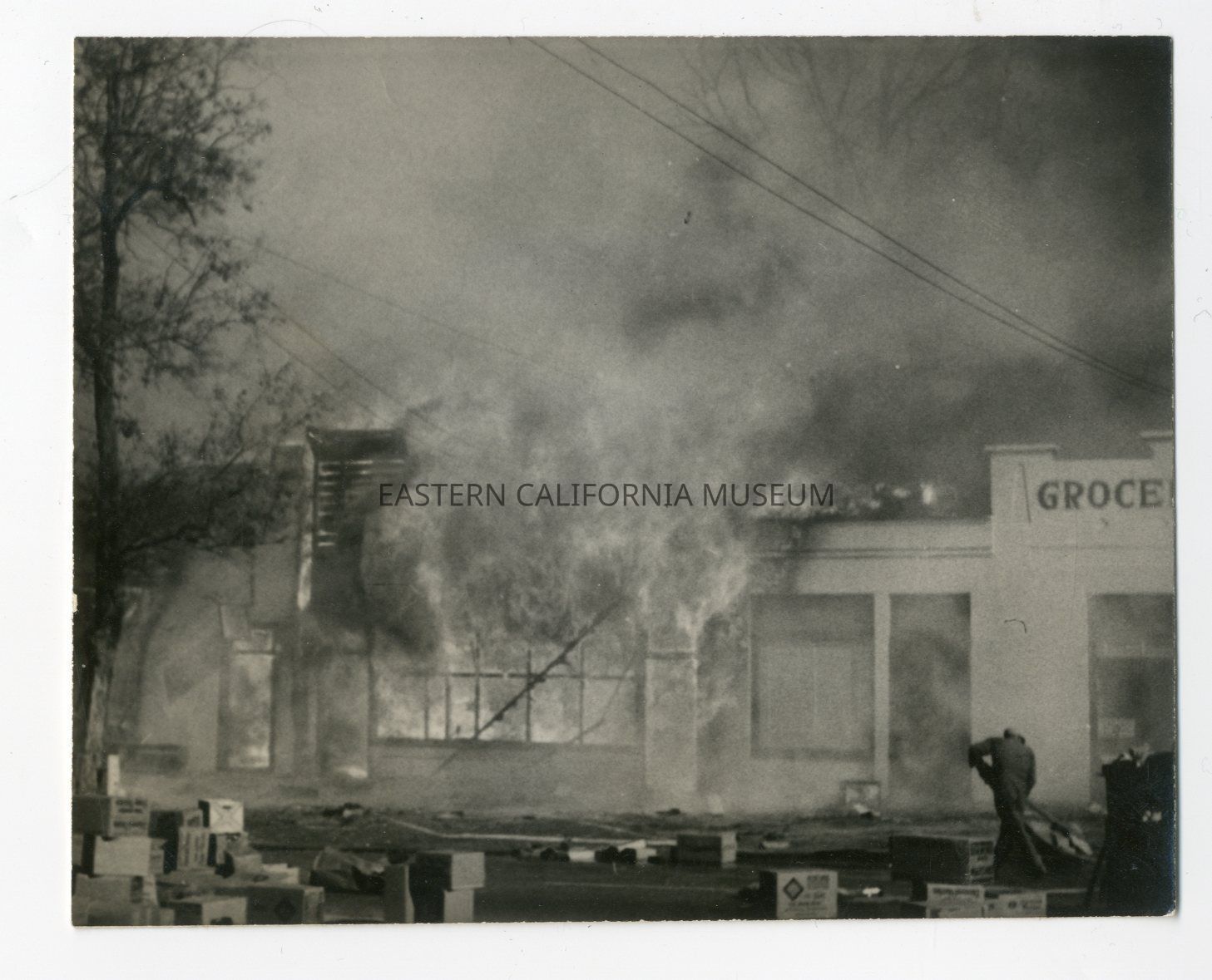 Written in black ink on reverse: Fire that nearly destroyed Big Pine, 1946 or 47. Building to right was Joseph's Grocery.Photograph Details