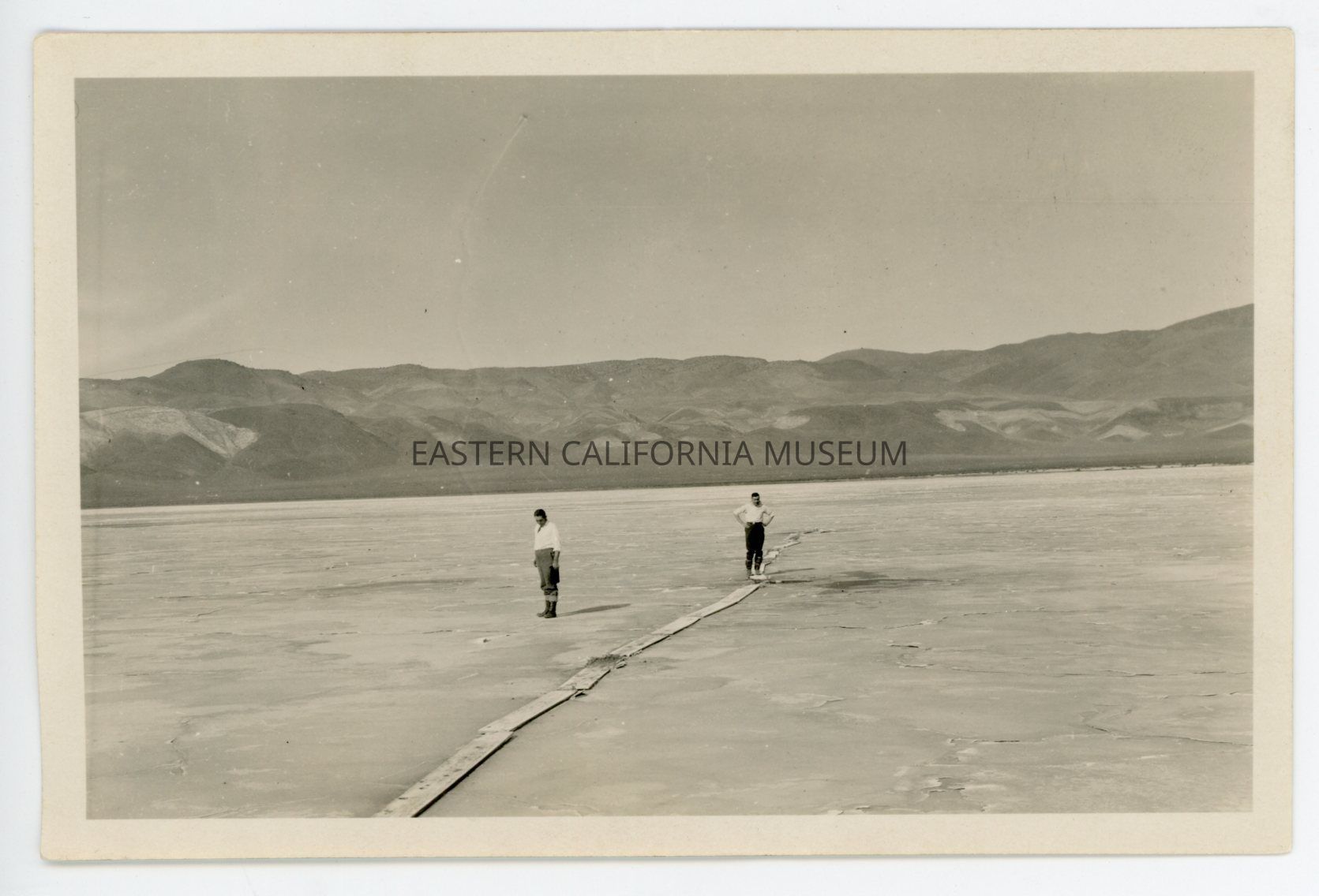 Photo of two men standing in a dry lakebed. There is a walkway of planks of wood laid directly on the ground, but only one man is standing on it. There are mountains in the background. The location and date are almost certainly Deep Springs, 1925.Photograph Details