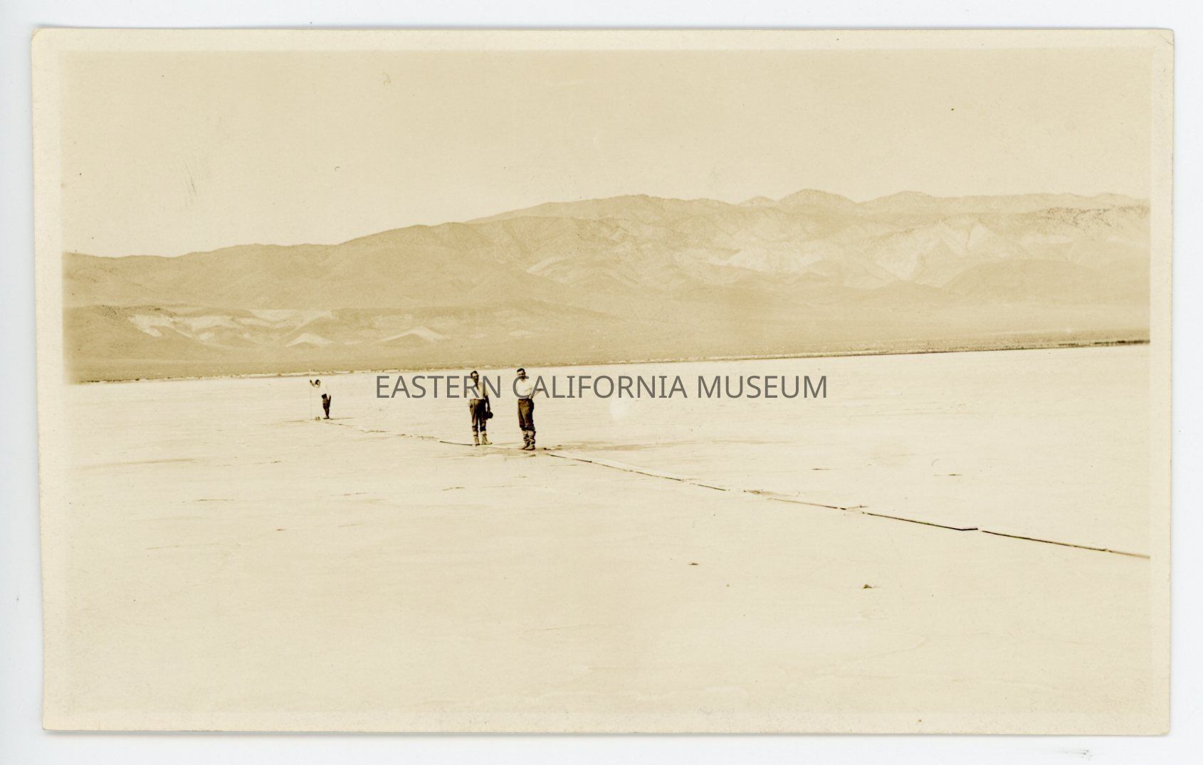 Photo of three men standing on a walkway of planks laid directly on the ground. There are mountains in the background. The location and date are almost certainly Deep Springs, 1925.Photograph Details