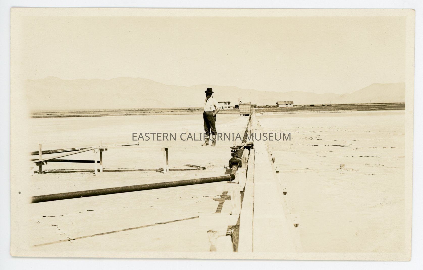 Photo of a man standing beside a raised wooden walkway and pipeline in the middle of a dry lakebed. There are several buildings in and mountains in the background. The location and date are almost certainly Deep Springs, 1925.Photograph Details