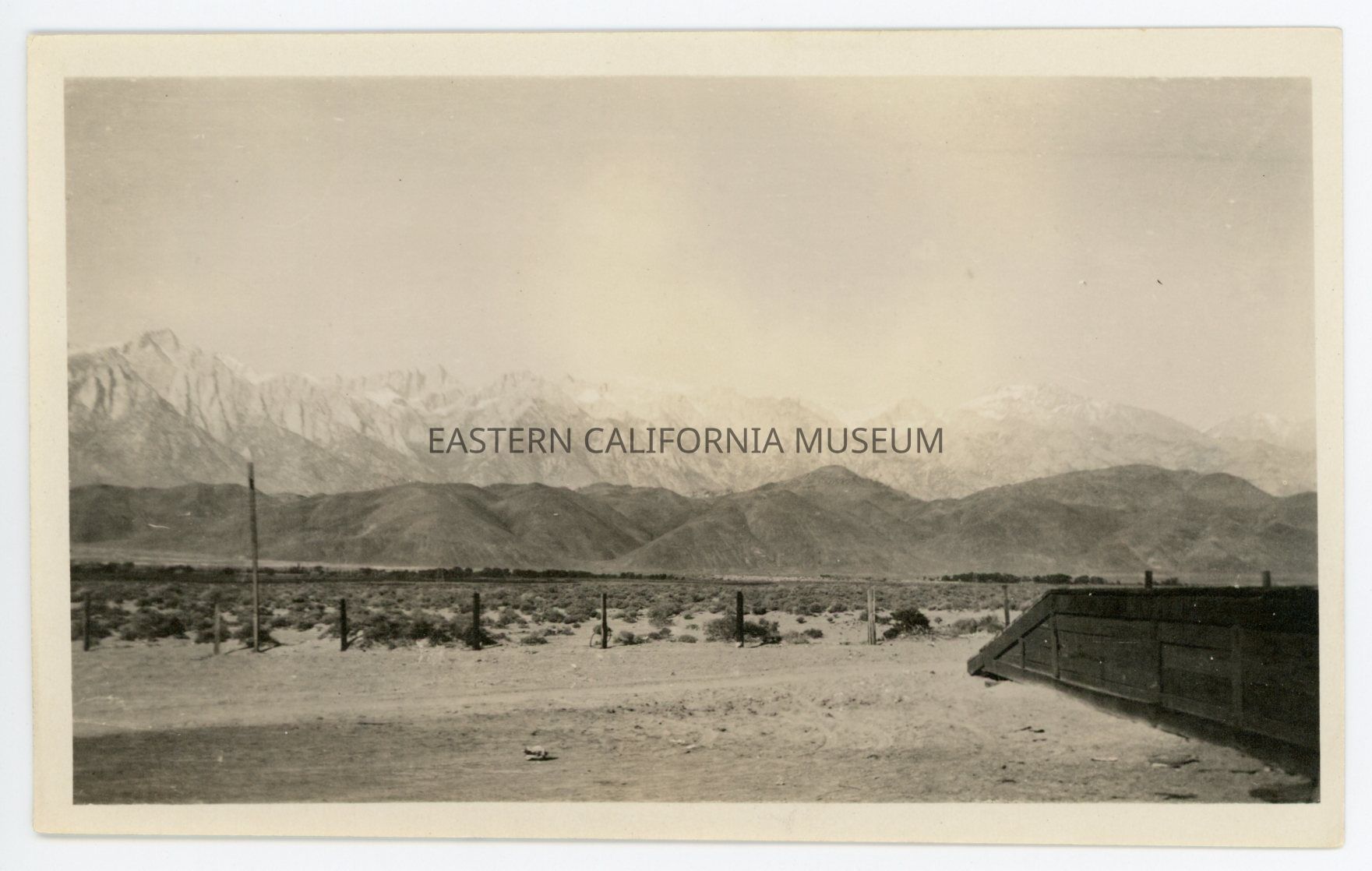 Photo of the Sierra Nevada mountain range adn Alabama Hills west of Lone Pine railroad station. A small section of the ramp and platform is on the right side of the photo. Mt. Whitney and Lone Pine Peak are visible.Photograph Details