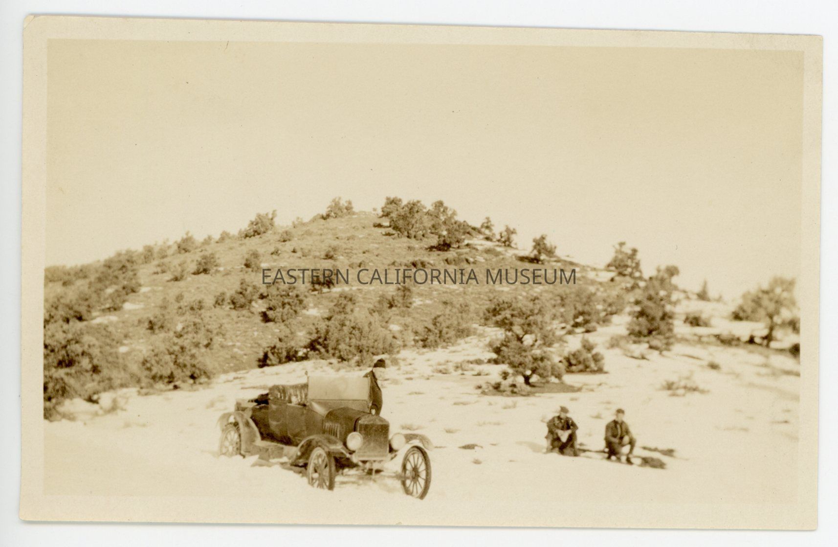 Photo of three men and an early automobile in the snow, probably on Westgard Pass.