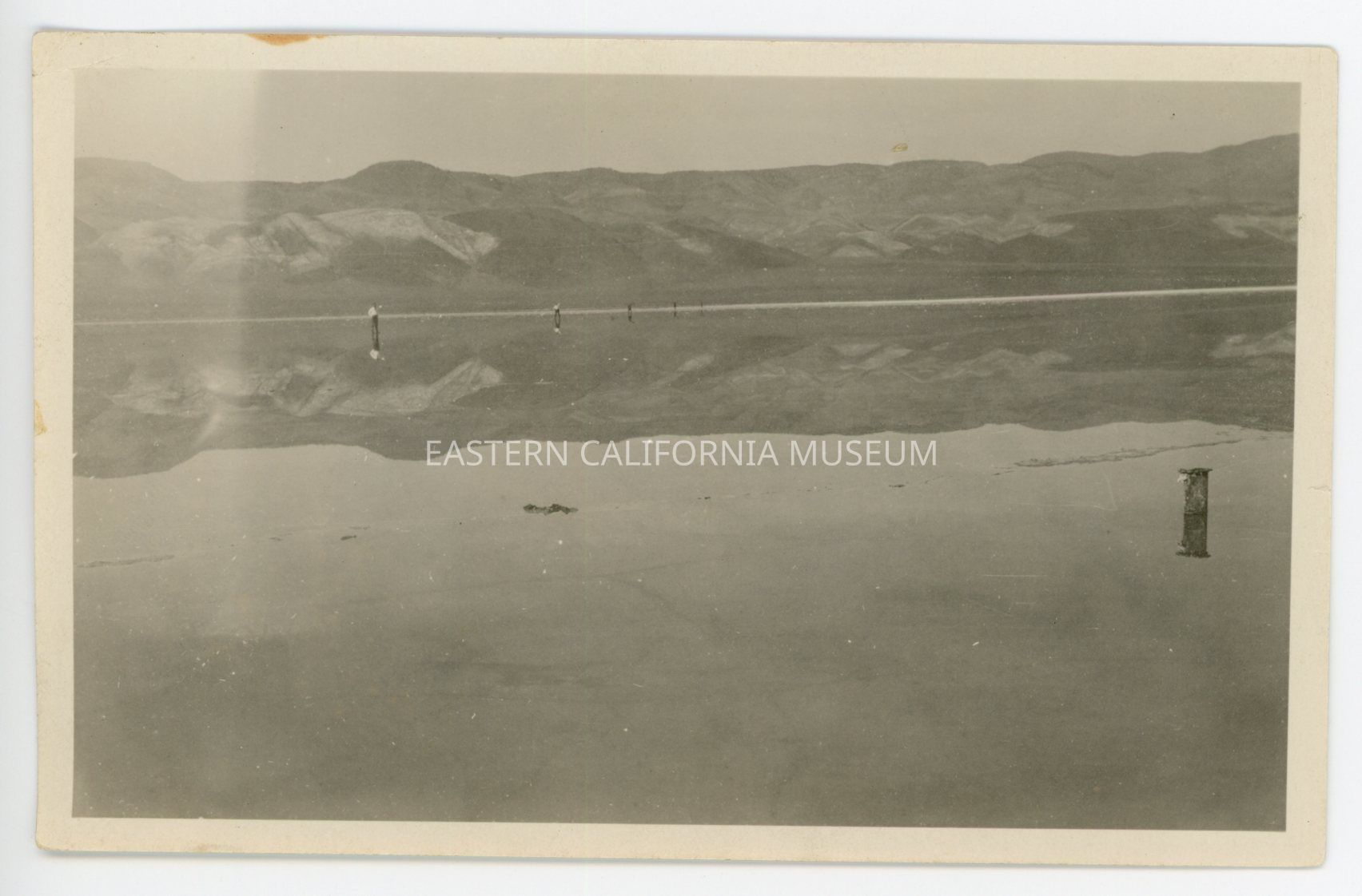 Photo of a lake reflecting the mountains in the background. It looks like there is some sort of pipe in the foreground. There are a few reflections that may be people standing in the water or on the shore. The date is almost certainly 1925.