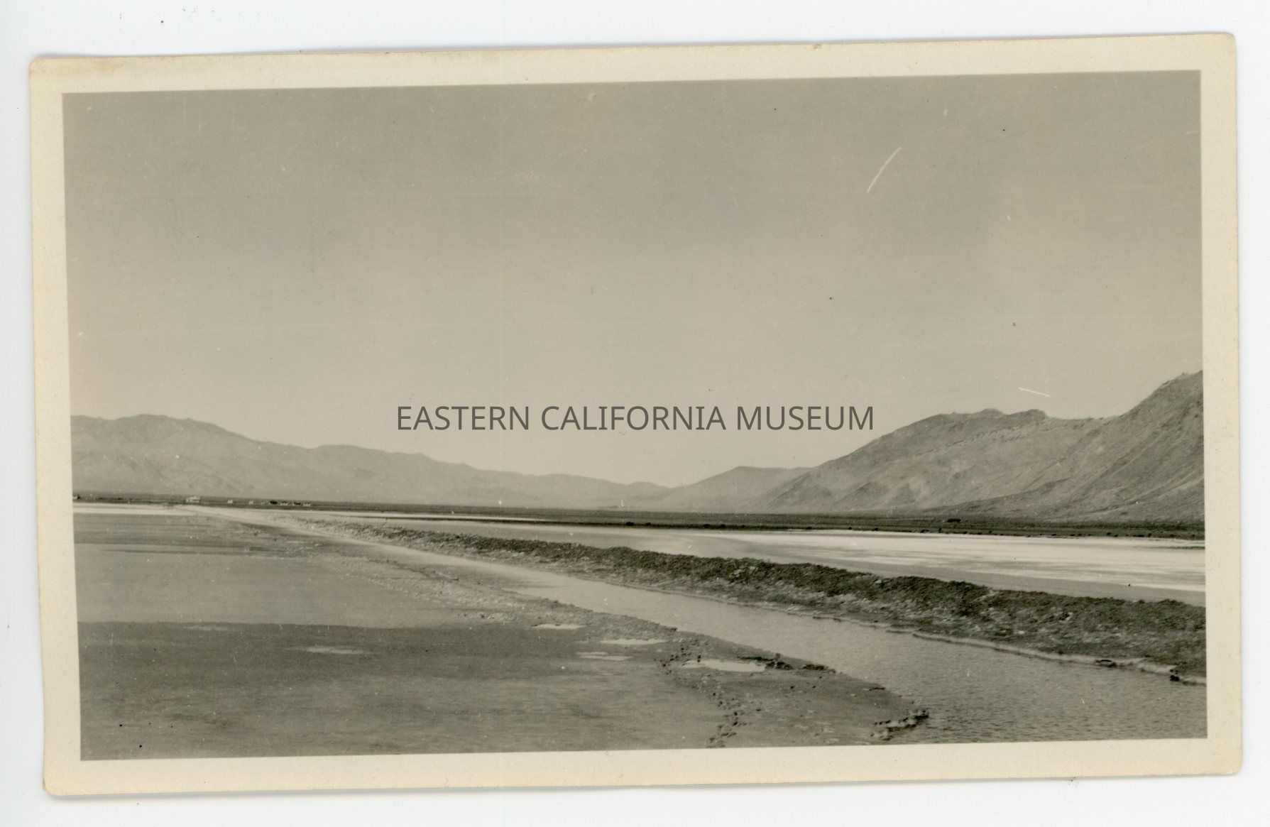 Photo of a straight channel filled with water through a lakebed. There are mountains in the background. The location and date are almost certainly Deep Springs, 1925.