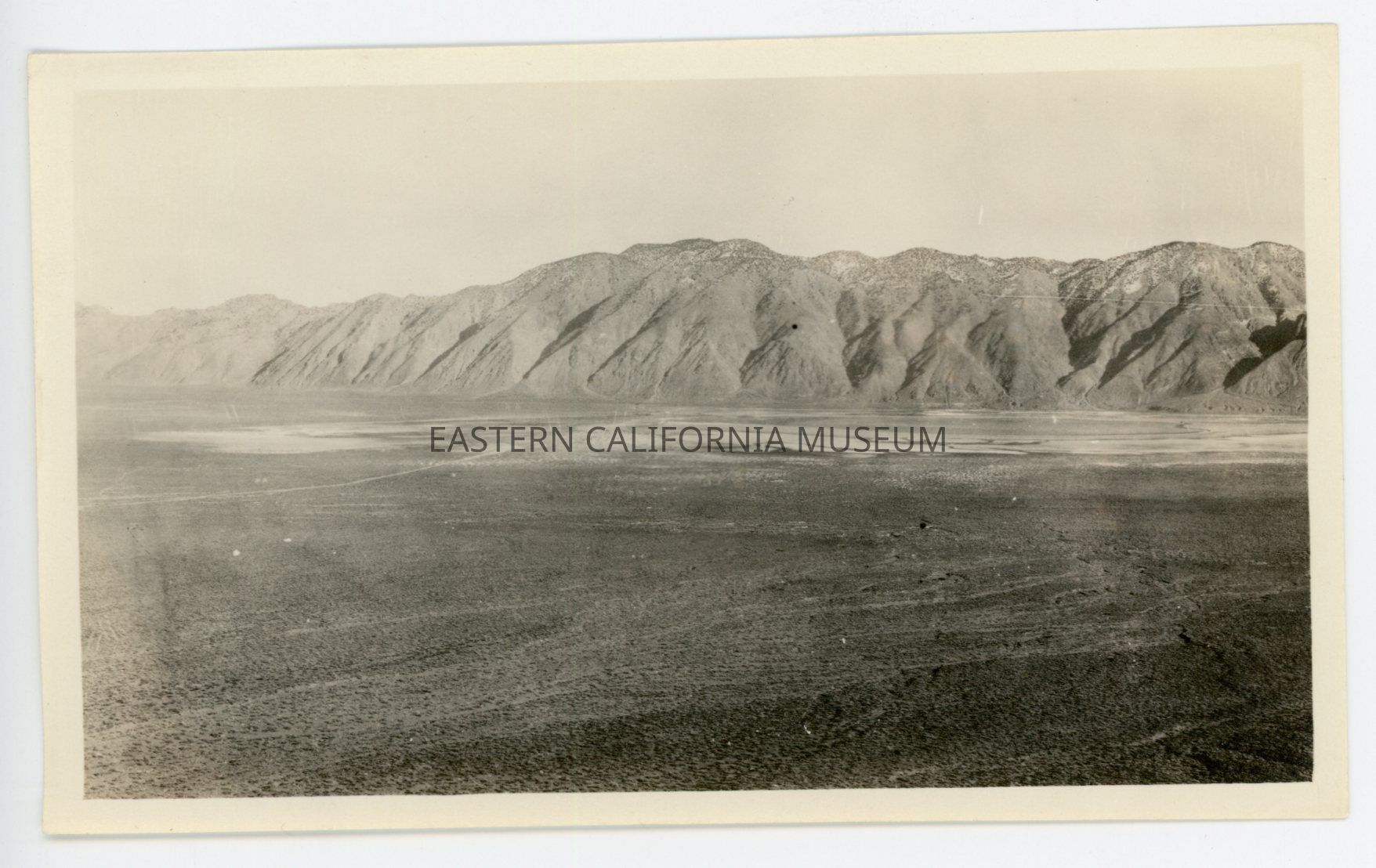 Photo taken from a high vantage point of what appears to be a dry lakebed (or just the desert landscape) and mountains. The location and date are almost certainly Deep Springs, 1925.Photograph Details