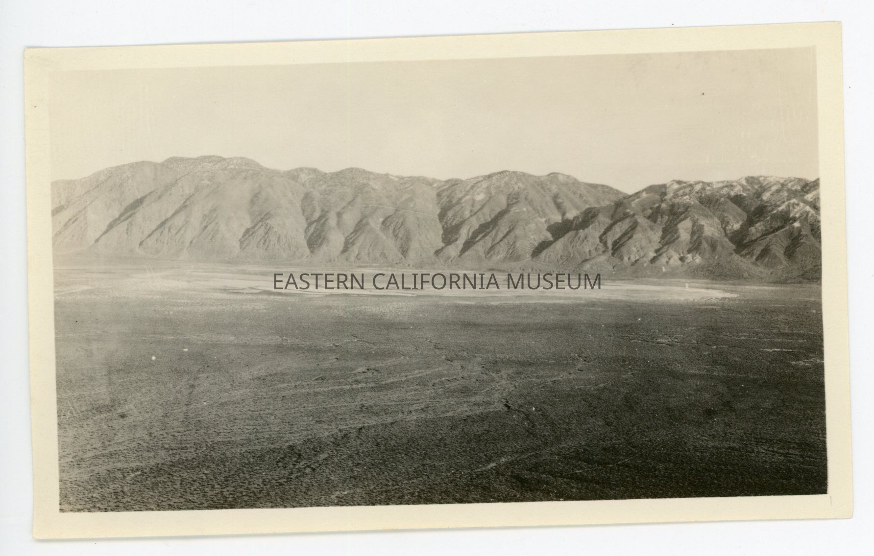 Photo taken from a high vantage point of what appears to be a dry lakebed (or just the desert landscape) and mountains. The location and date are almost certainly Deep Springs, 1925.Photograph Details