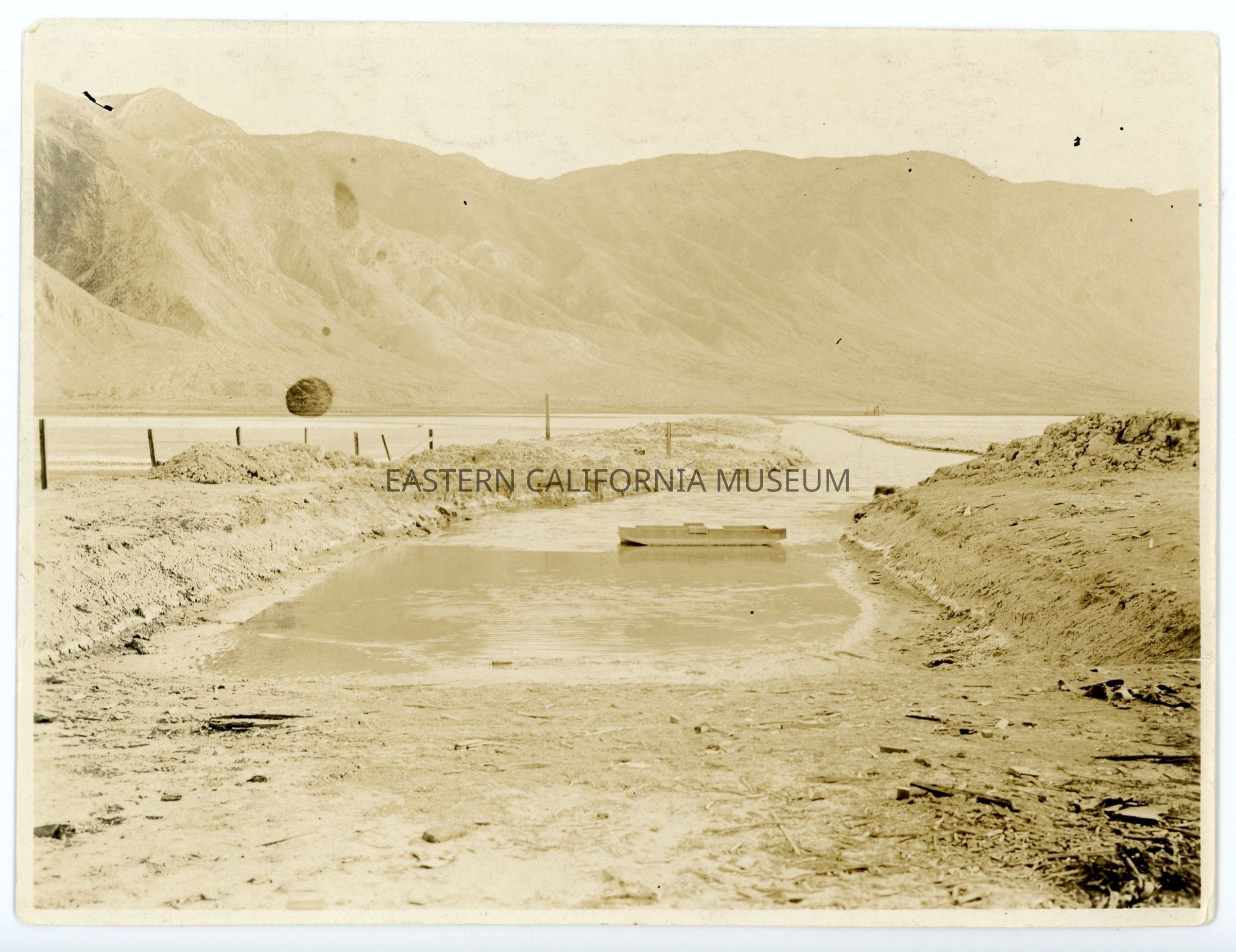 Photo of one end of a channel with water in it. There is a small wooden item (a skiff?) in the channel. There are mountains in the background.
