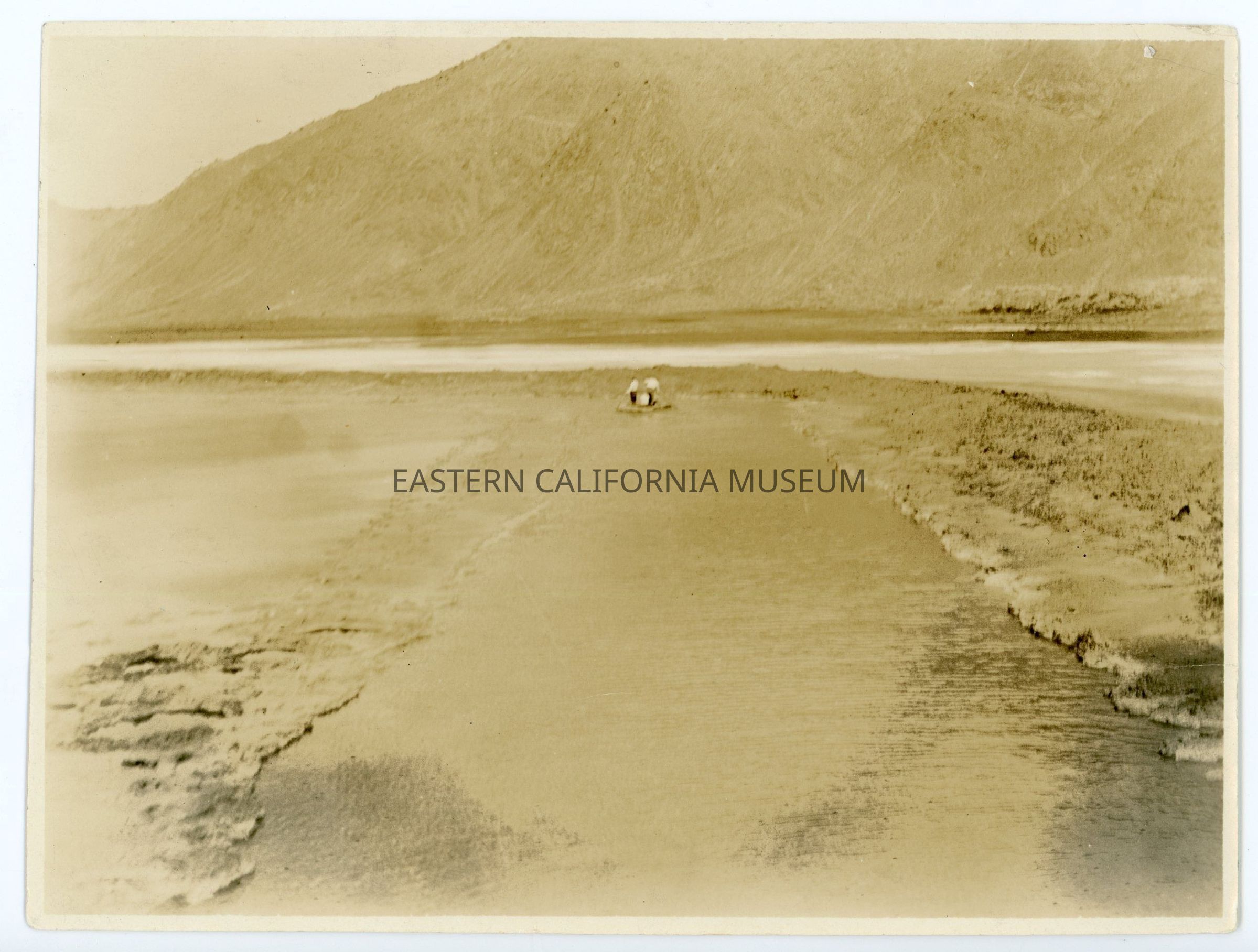 Photo of two men on a small floating device (the tiny skiff seen in 1973.48.15?). They appear to propel it with long poles. They are "sailing" in a channel through a lakebed. There are mountains in the background.