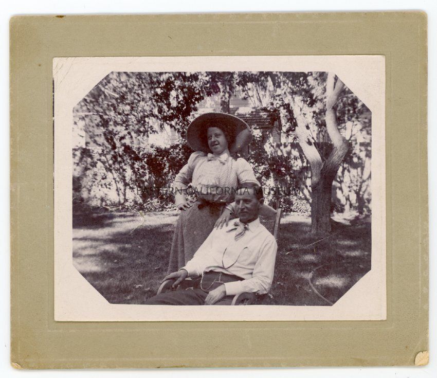 Mounted exterior photo of a seated man and a woman standing next to him with her hand on his shoulder. They are identified on the reverse as father and daughter Nettie Irwin and John C. Irwin.