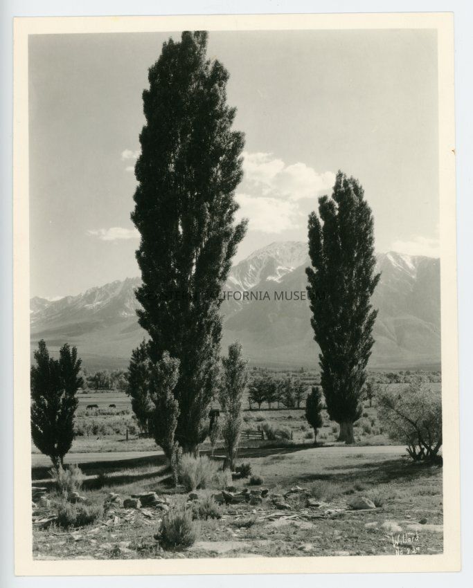 Photo of tall trees with Sierra Nevada in the background. Labeled with, "Willard No. 829" in lower right corner.