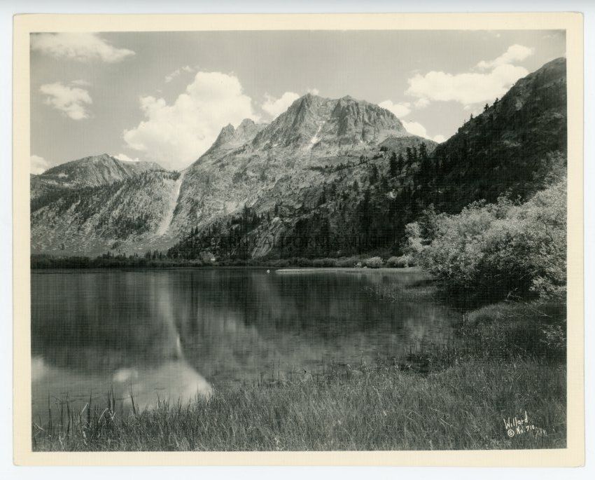 Photo of a lake surrounded by tall mountains. Labeled with, "Willard No. 710" in lower right corner. It is on textured paper.
