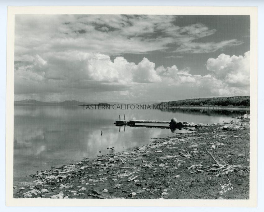 Photo of a dock on the shore of Mono Lake. Labeled with, "Willard No. 805" in lower right corner. It is on textured paper.