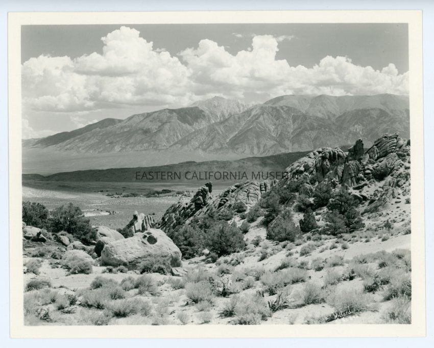 Photo taken looking out over valley towards mountain range. Large boulders in foreground. Labeled with, "Willard No. 892" in the lower right.