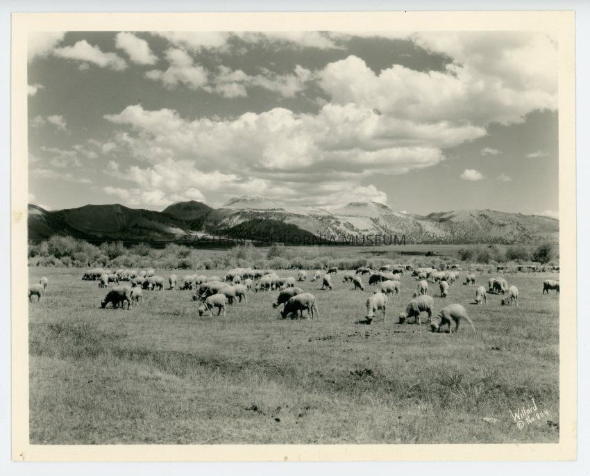 Photo of a herd a sheep grazing in a meadow or pasture. Mountains in the background. Labeled with, "Willard No. 804" in the lower right corner.