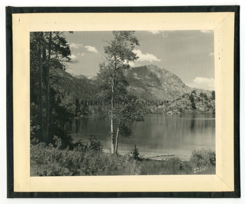 Mounted and encapsulated photo of a lake surrounded by mountains. There is an aspen tree in the center foreground and a canoe is visible on the lake towards the left. Labeled with, "Willard No. 574" in the lower right corner. It is on textured paper.