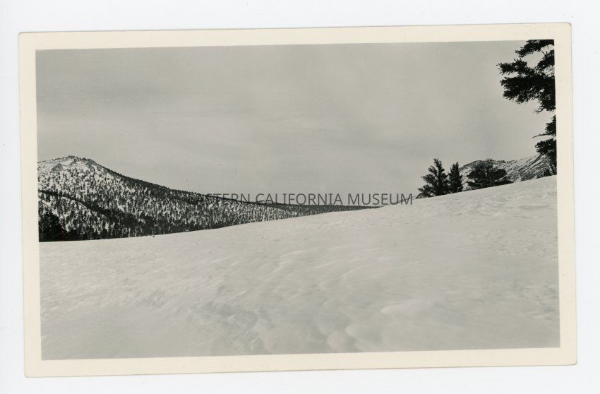 Photo of a snowy slope with mountains off to left side. Written in pencil on reverse: Cottonwood Canyon.