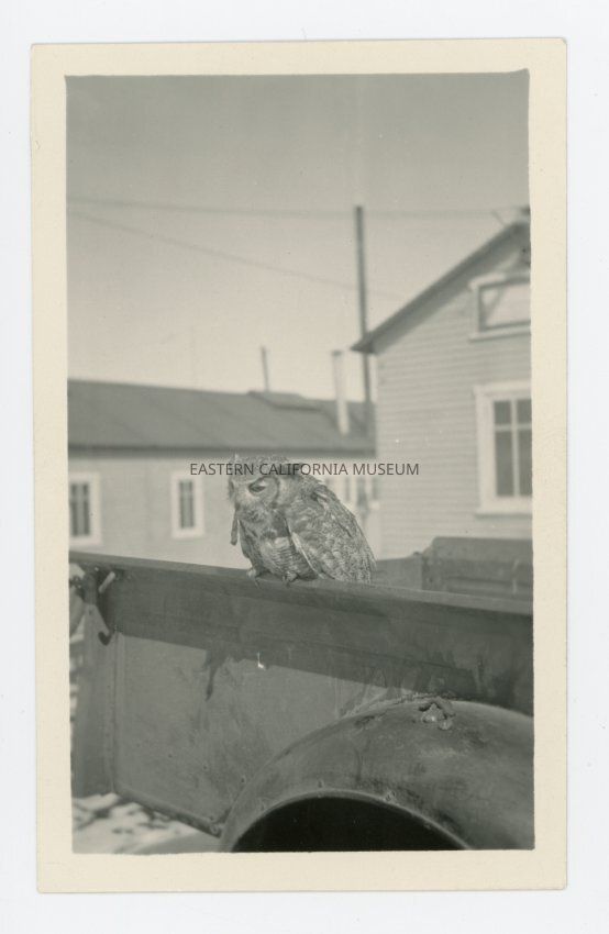 Photo of an owl perched on the side of a truck. Buildings visible in background. Written in pencil on reverse: Owl at Mono Lake.
