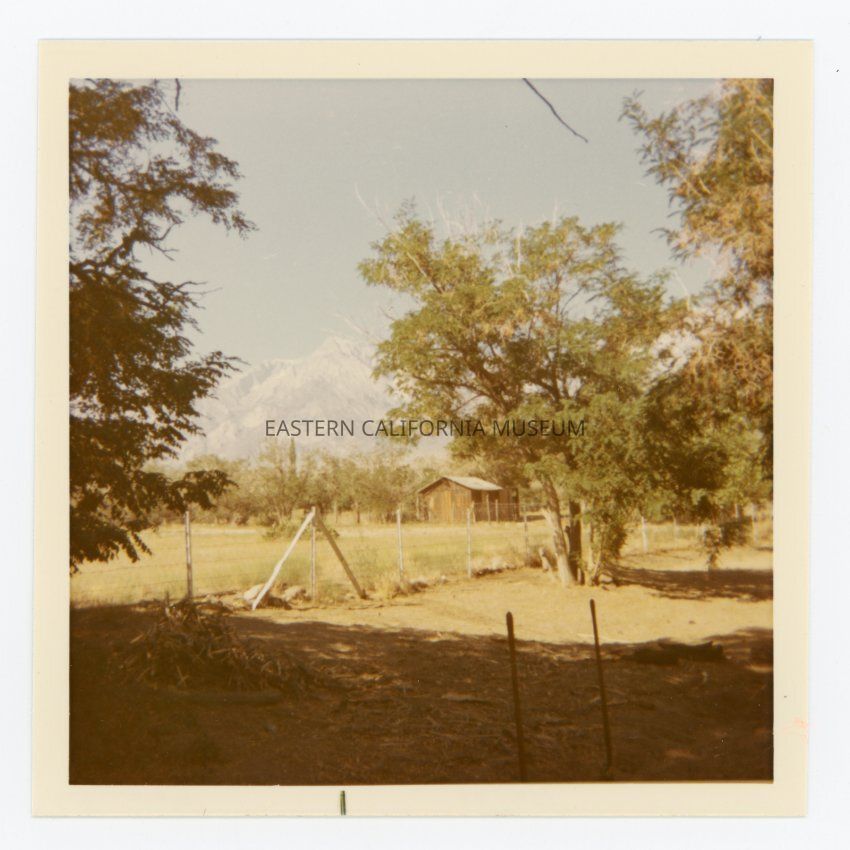 This photo is of a field, fence, and trees with mountains in the distance. There is a building in the center.Collection