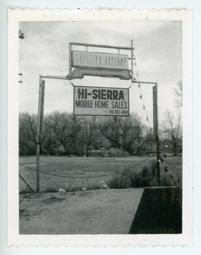 Black and white Polaroid photo with scalloped edges on top and bottom. Photo is of a sign saying, "Hi-Sierra Mobile Home Sales / Ph. 873-4810".