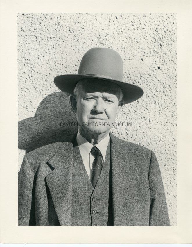 Black and white portrait of Arlie Brierly standing against a stucco wall. He is wearing a hat, suit, vest, and tie.