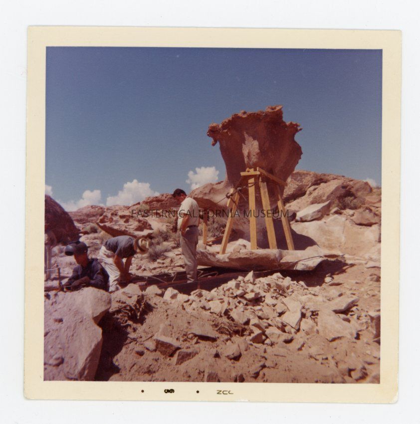 This photo is of a crew working to load up the selected tuff [tufa] formation onto a flatbed trailer.Collection