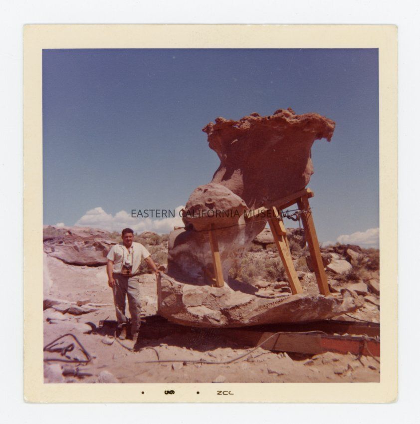 Color photo taken of the selection, transportation, and installation of the tuff [tufa] formation in front of the courthouse in 1965.