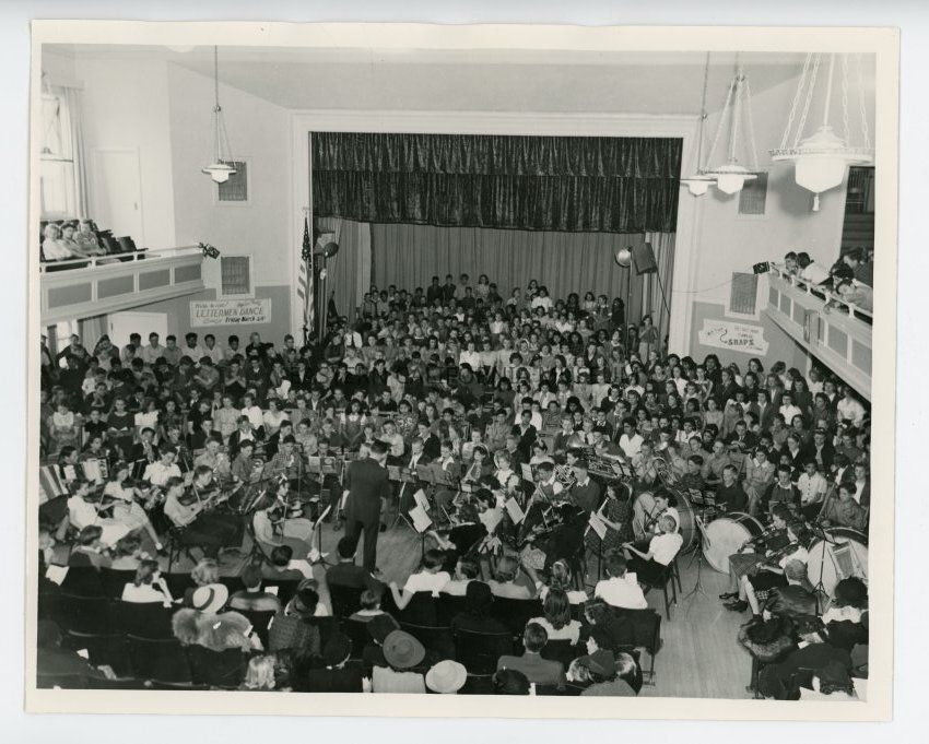 Photo of an orchestra program in the auditorium/theatre at Bishop Union High School. The musicans appear to be high school aged or younger. There are people sitting on the stage and balcony while the orchestra performs in the middle of the room. There are posters on the walls for a Letterman dance on Friday, March 28th and also an advertisement saying, "Get out your camera snaps."Collection